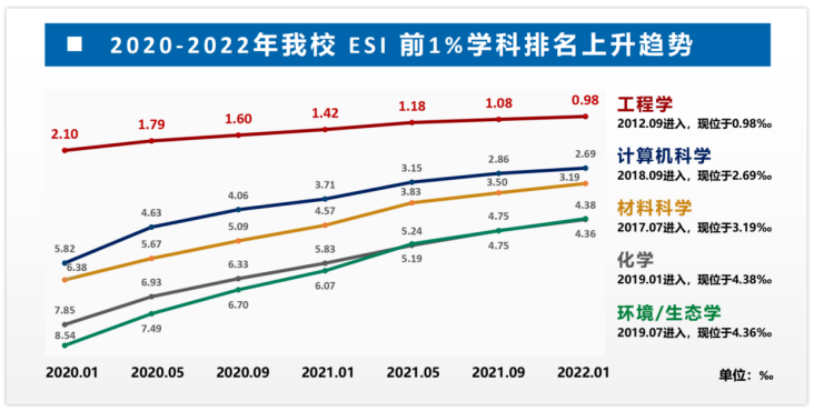 截至目前,我校共有工程学(Engineering)、材料科学(Materials Science)、计算机科学(Computer Science)、化学(Chemistry)、环境/生态学(Environment/ Ecology)共5个学科进入ESI全球排名前1%,综合排名位居中国内地高校第99位,相较2020年提升13位。