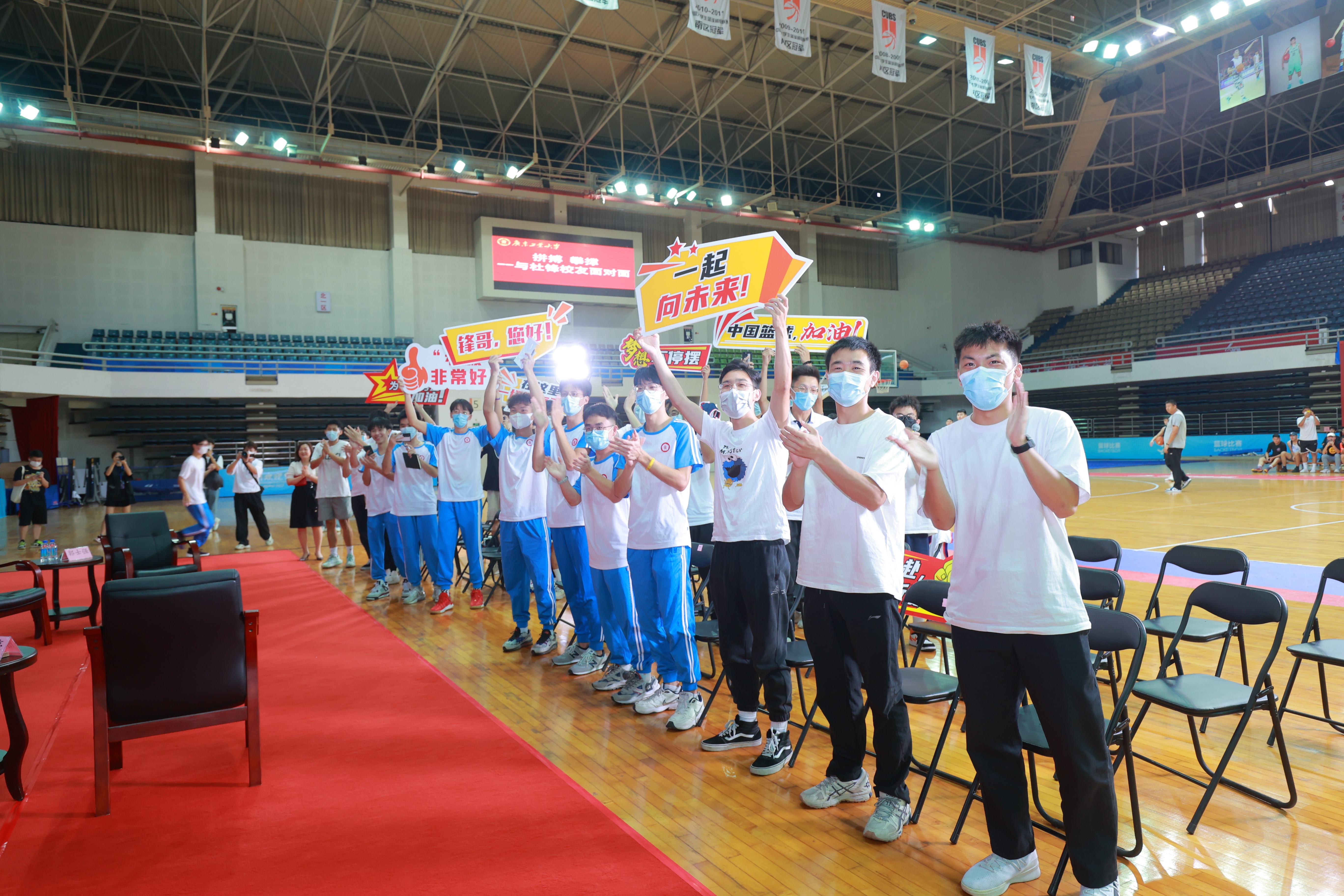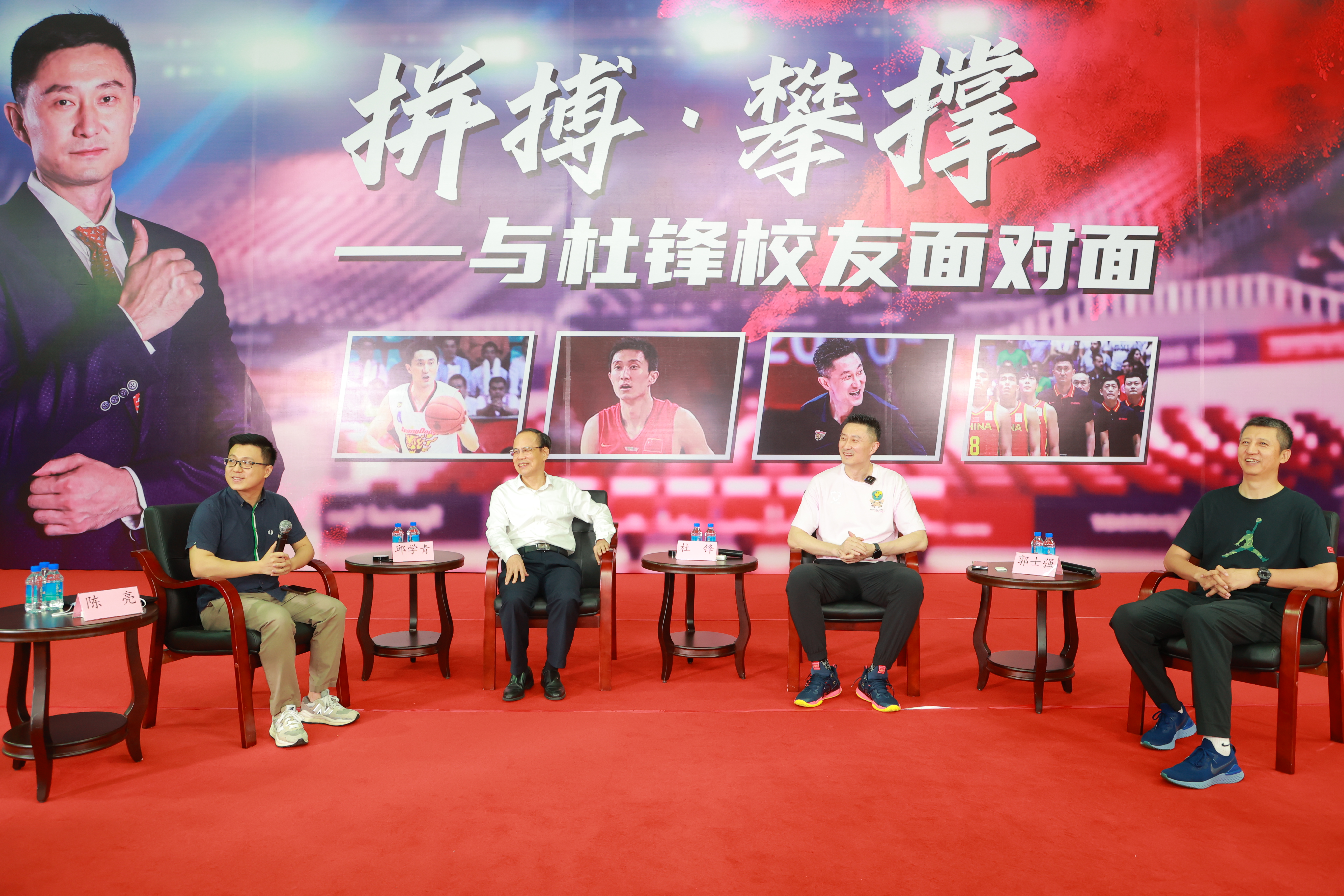 “欢迎杜锋师兄回家!”“锋哥,您好!”“全力以赴,忠于所爱!”交流现场,同学们高举“应援”欢迎牌,点燃现场气氛。邱学青、杜锋和郭士强一起,与在场学生进行热烈互动。