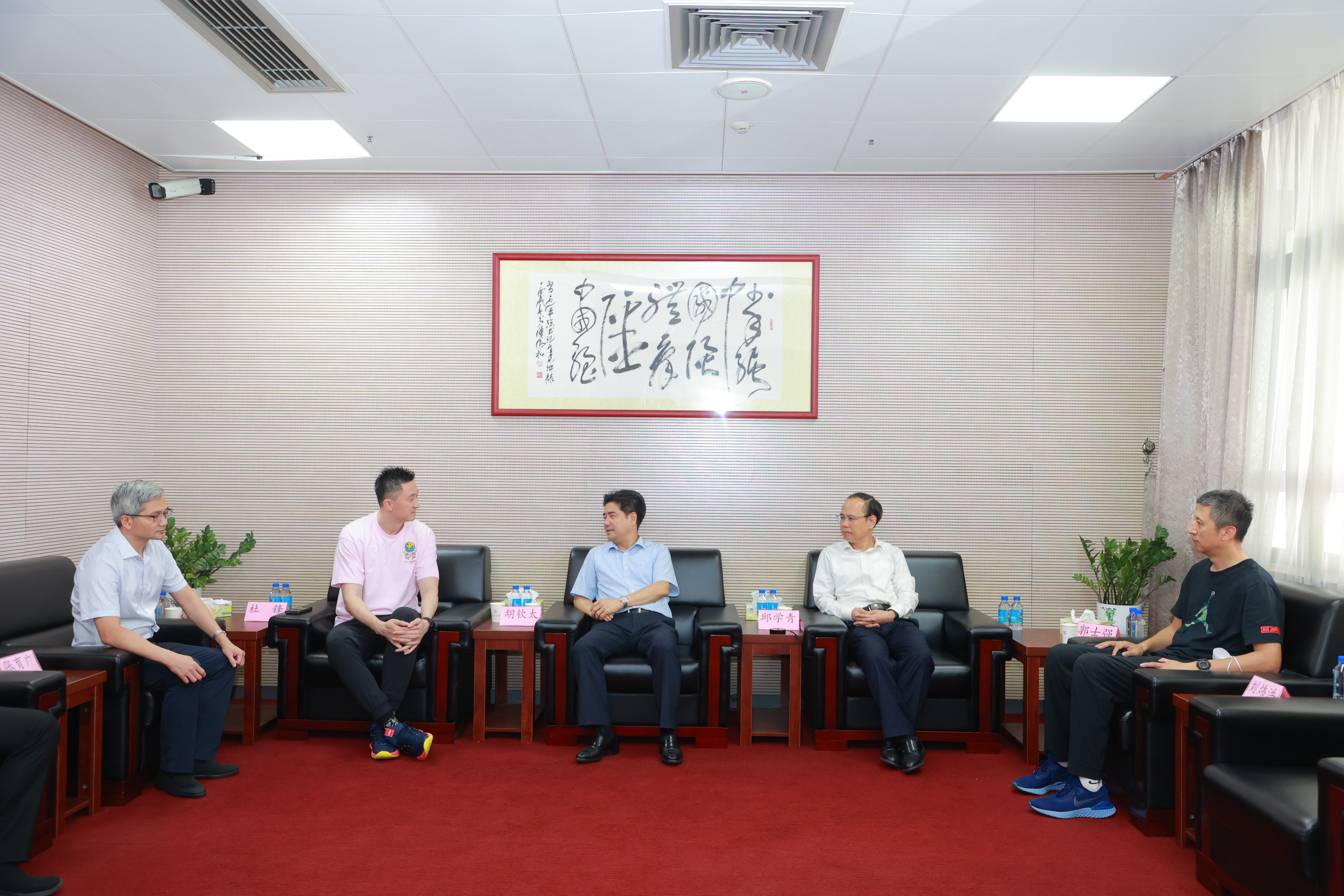 胡钦太对杜锋回到母校表示热烈欢迎,邱学青向杜锋介绍了近年来学校体育发展情况,感谢他回校为师弟师妹带来精彩的分享活动。杜锋感谢母校对自己的培养、关心与支持,希望可以为母校做力所能及的事情。双方互赠纪念品。