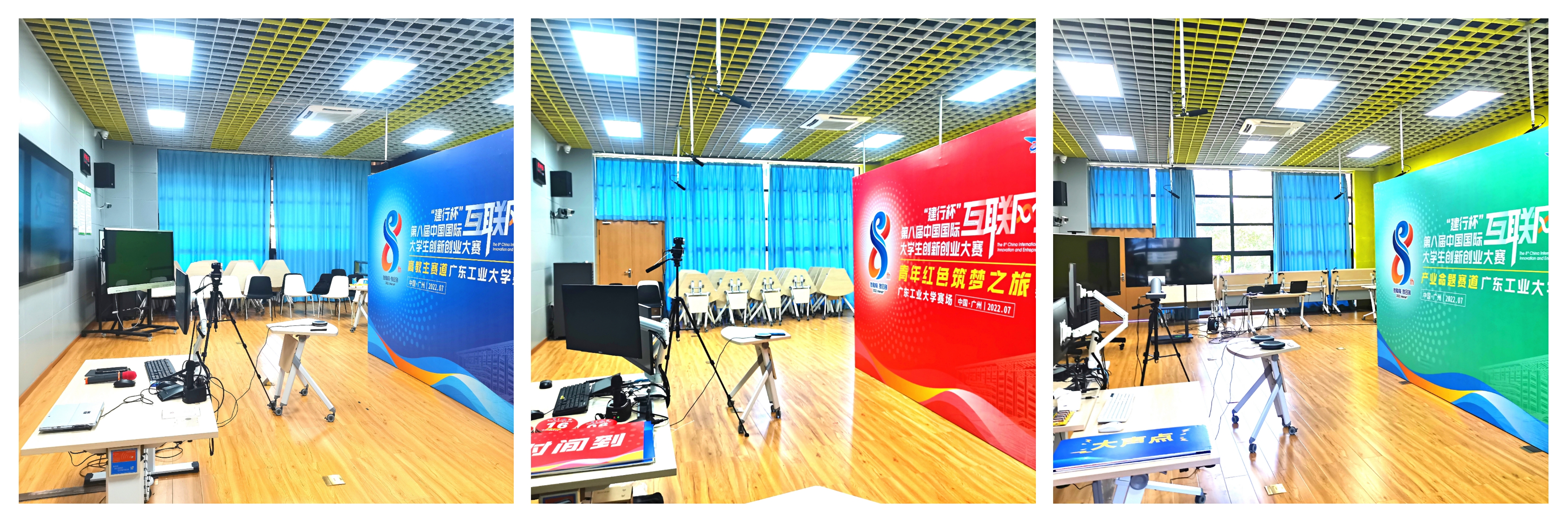 按照疫情常态化防控的要求,省决赛紧急调整组织方式,改为线上比赛的方式举行,评审端设在东莞理工学院松山湖校区,专家评委集中分组评审,展示端由参赛学校自行搭建,参赛团队集中在各自学校完成线上展示与答辩。学校迅速反应制定方案,第一时间根据大赛要求细化落实学生留校管理、住宿及备赛场地软硬件问题,高质量推进省决赛筹备工作,为参赛团队搭建了9间答辩室、1间备用室和1间等候室,统一配备调试视频会议所需硬件设备、网络设施。学生工作处、创新创业学院、后勤管理处、网络信息与现代教育技术中心、课室管理中心等相关部门全力协作保障比赛场地、设备、网络万无一失。筹备期间,在场地、设备、人员、过程控制等多个方面开展全流程实战演练,工作人员一日一会总结模拟过程中存在问题,做到及时完善和调整,为参赛团队提供最好的赛事环境。