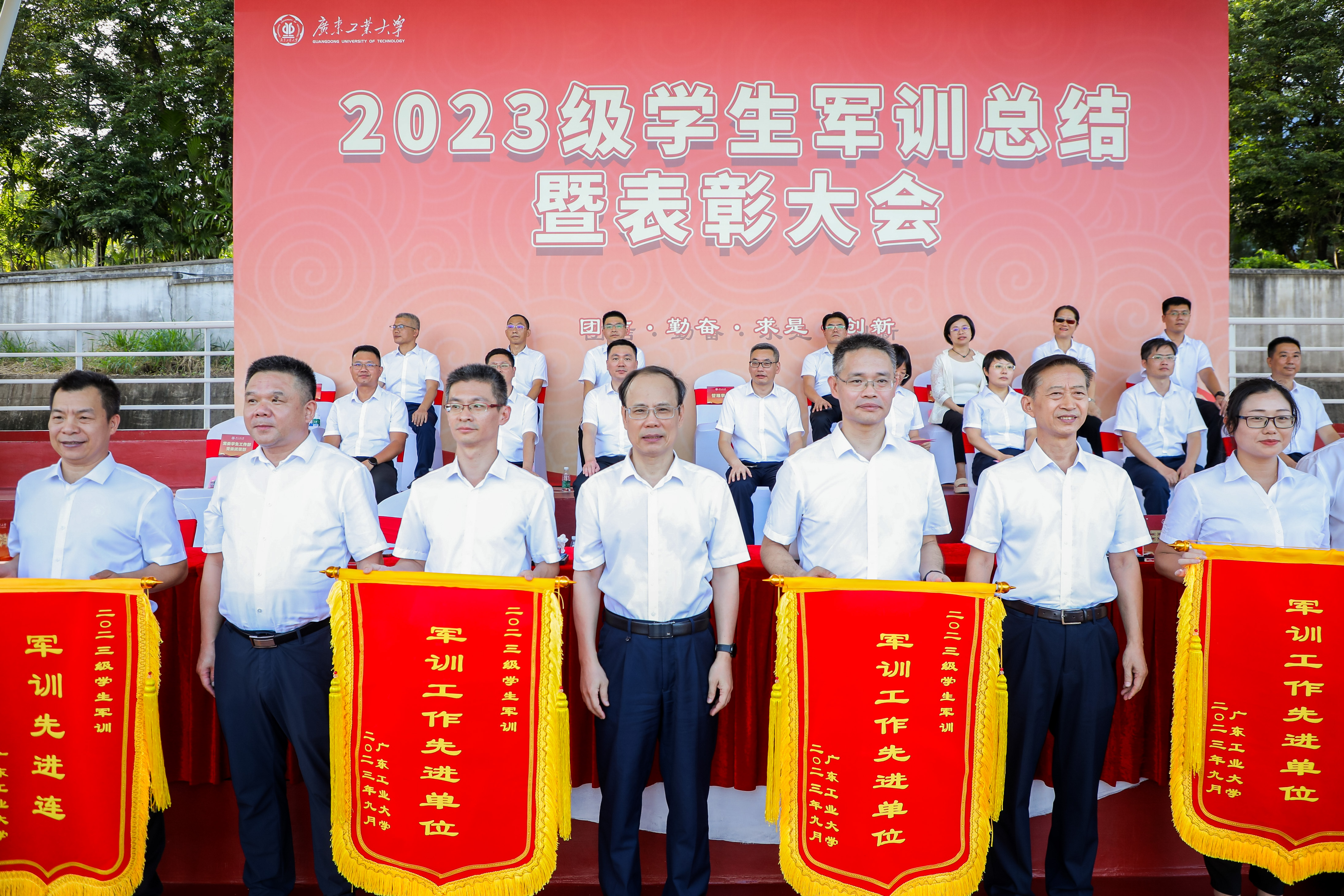 “逐梦新征程,攀撑创未来。站在新的历史方位,广大青年学子要立志做有理想、敢担当、能吃苦、肯奋斗的新时代好青年,为全面建设社会主义现代化国家贡献青春力量!”胡钦太、邱学青、朱蔚蔚作军训总结讲话,代表学校向承担军训任务的军训教官、军训工作人员和老师们表示衷心的感谢,向圆满完成军训任务的2023级全体本科生表示祝贺。并寄语同学们要坚定理想信念,永葆家国情怀不褪色;要发扬优良传统,坚持修身立德不变质;要练就过硬本领,接续团结奋斗不松懈,在“请党放心,强国有我”的时代号召下,在“团结、勤奋、求是、创新”的校训引领下,在“逐梦攀撑”的广工精神激励下,勇担时代重任,不负青春韶华,做有理想、敢担当、能吃苦、肯奋斗的新时代好青年,以更加优异的成绩迎接学校本科办学65周年,让青春在全面建设社会主义现代化国家的火热实践中绽放绚丽之花!