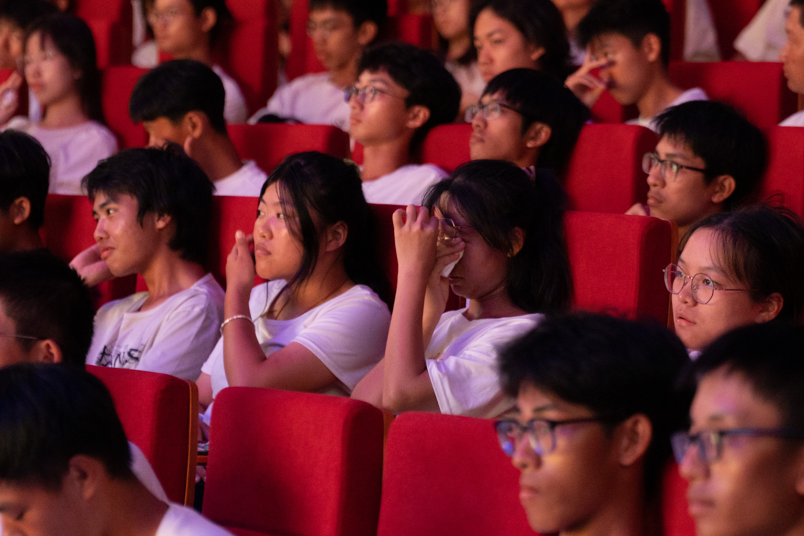 围绕胡钦太的授课主题,广工原创情景史诗剧《青春印丰碑》总导演郑萌和执行导演、剧目主演陈蕾分别走上舞台,以现场解说+视频展演的方式,把“青年担当”的思政教育内容融汇贯穿在艺术作品的欣赏之中。剧中原型人物、广工1965届校友、东深供水工程建设者代表陈汝基现身大荧幕现场连线,为学校即将迎来本科办学65周年送上祝福,为师弟师妹加油鼓劲。学校高水平舞蹈团演绎了剧目衍生舞蹈作品《洪流》。同学们跟随舞蹈演员的舞步回到热火朝天的“东深”建设现场,因临危受命而紧张,为风雨“征战”而揪心,被“人在,围堰在”的誓言所震撼……不知不觉间,不少同学红了眼眶。