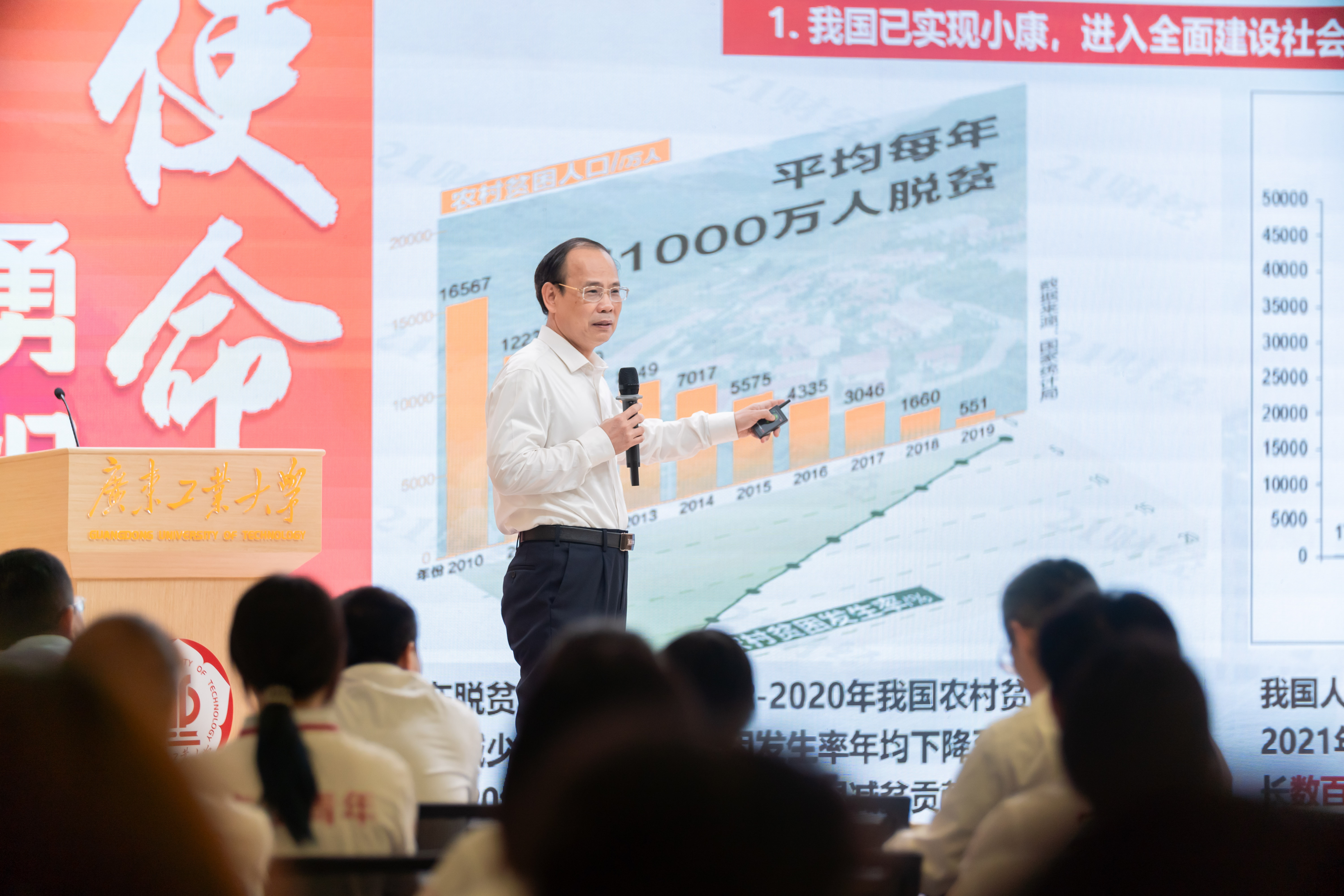 邱学青鼓励大家要善于发掘闪光的“偶像”,用“偶像”带来的精神力量推动自己前行。“杰出的无产阶级革命家、我们广工的第一任党委书记曾志就是广工人最应该追的‘星’;响应国家号召投身东深供水工程建设的广工师生是我们都要学习的楷模;我相信,团结拼搏、勇攀高峰的广工男篮也已经是很多同学的偶像。”邱学青说,榜样是有形的正能量、鲜活的价值观,是最直接、最直观的言行楷模,广大青年要争做榜样的忠实“粉丝”,让思想和行动时刻向榜样看齐,将榜样精神内化于心、外化于行。