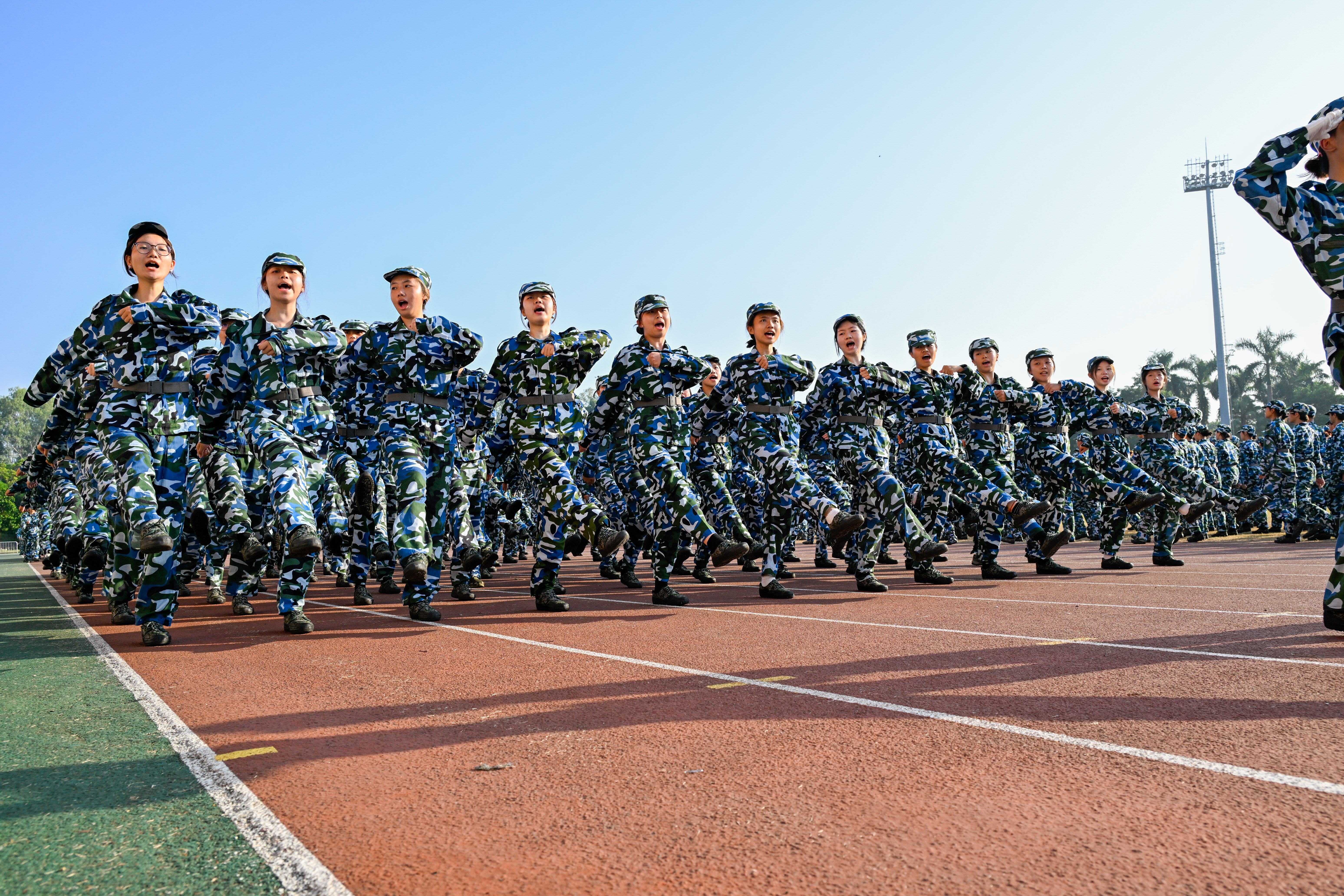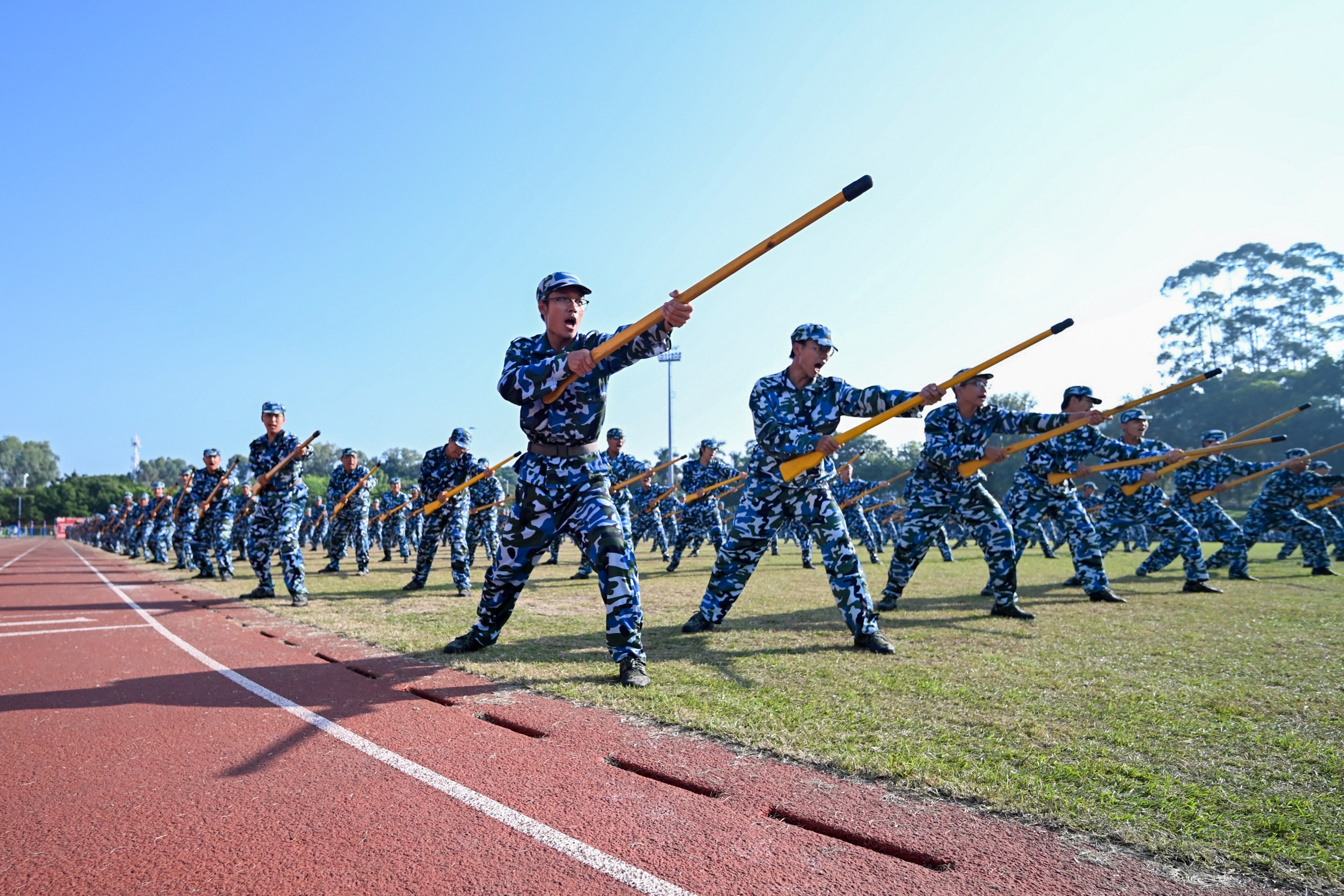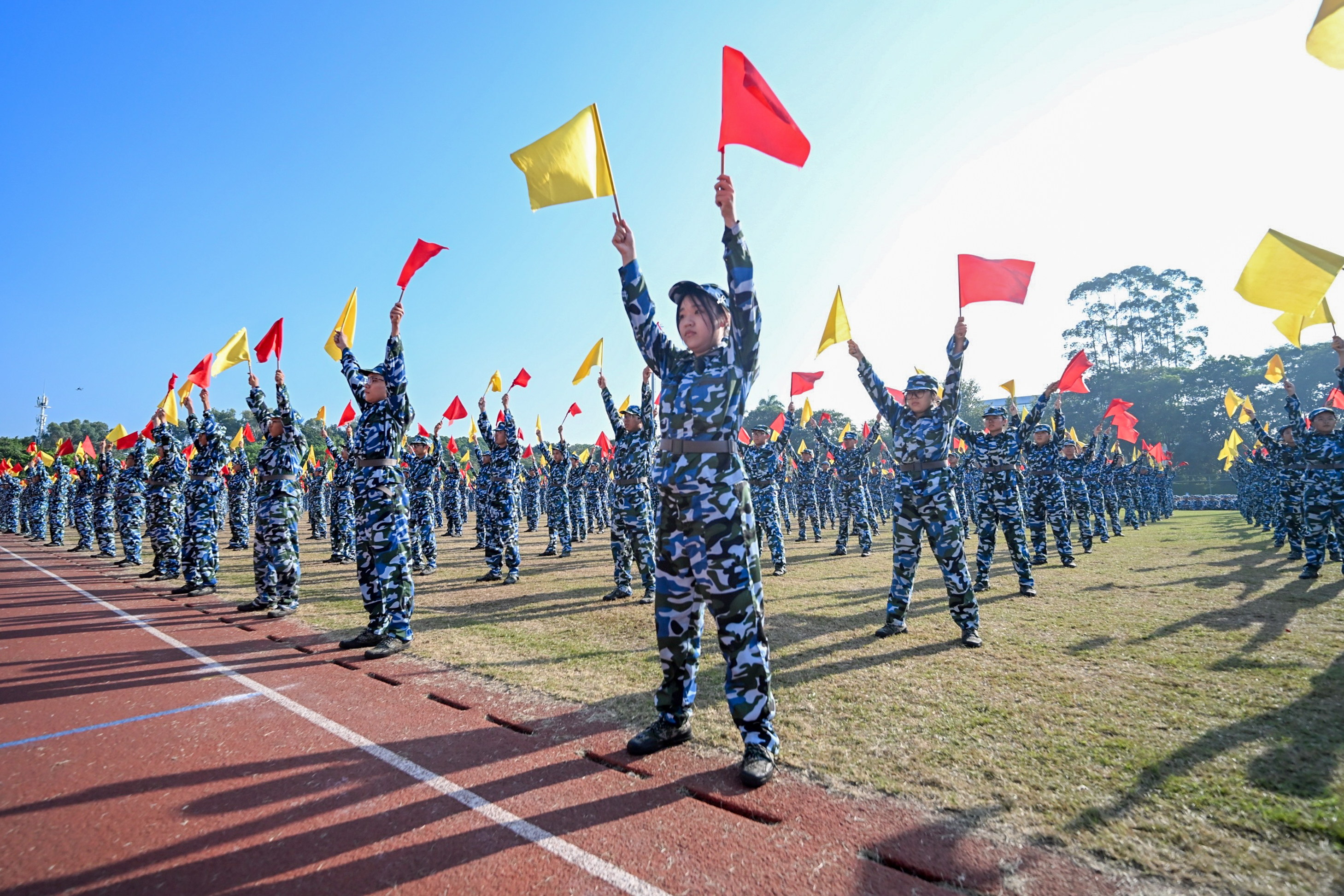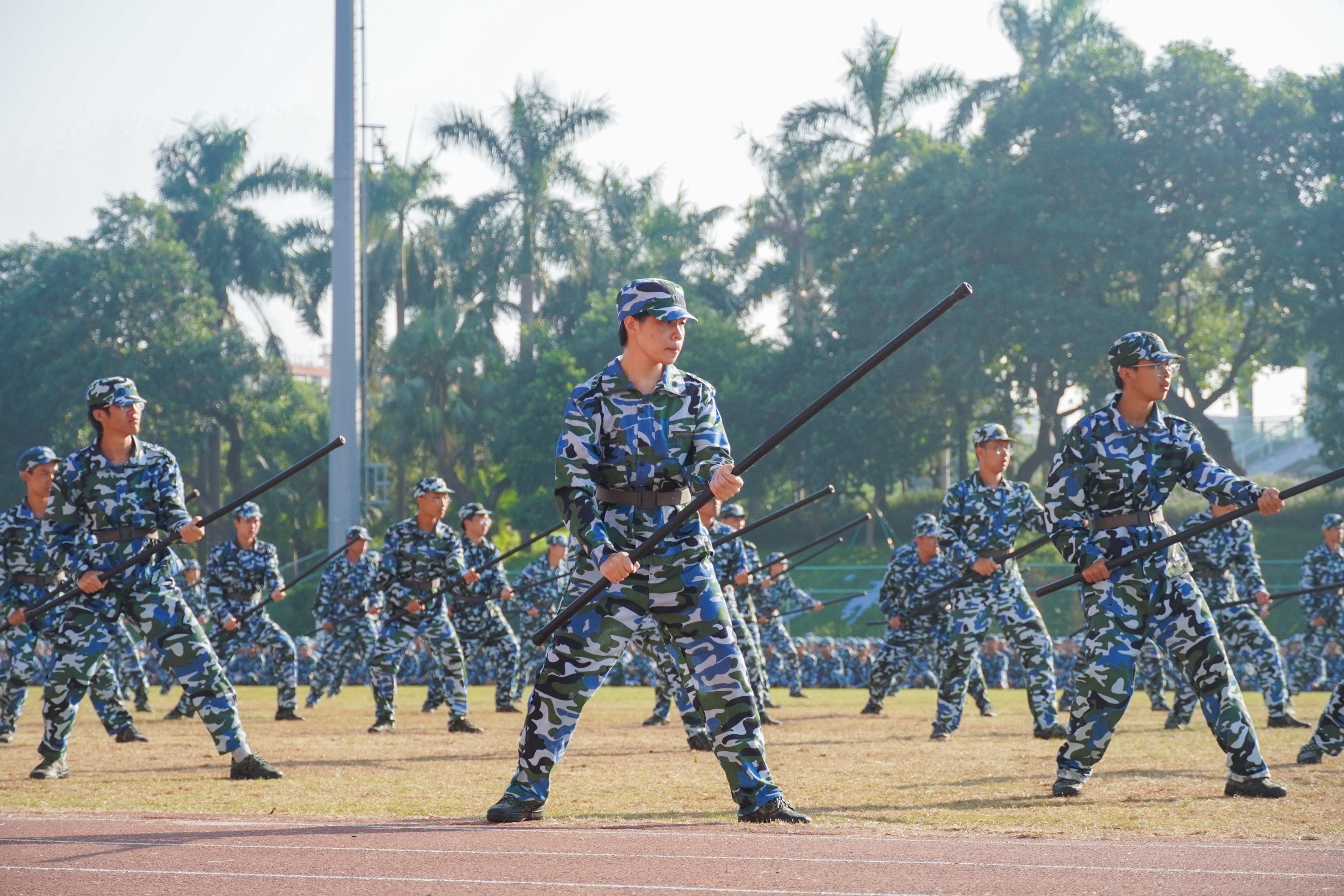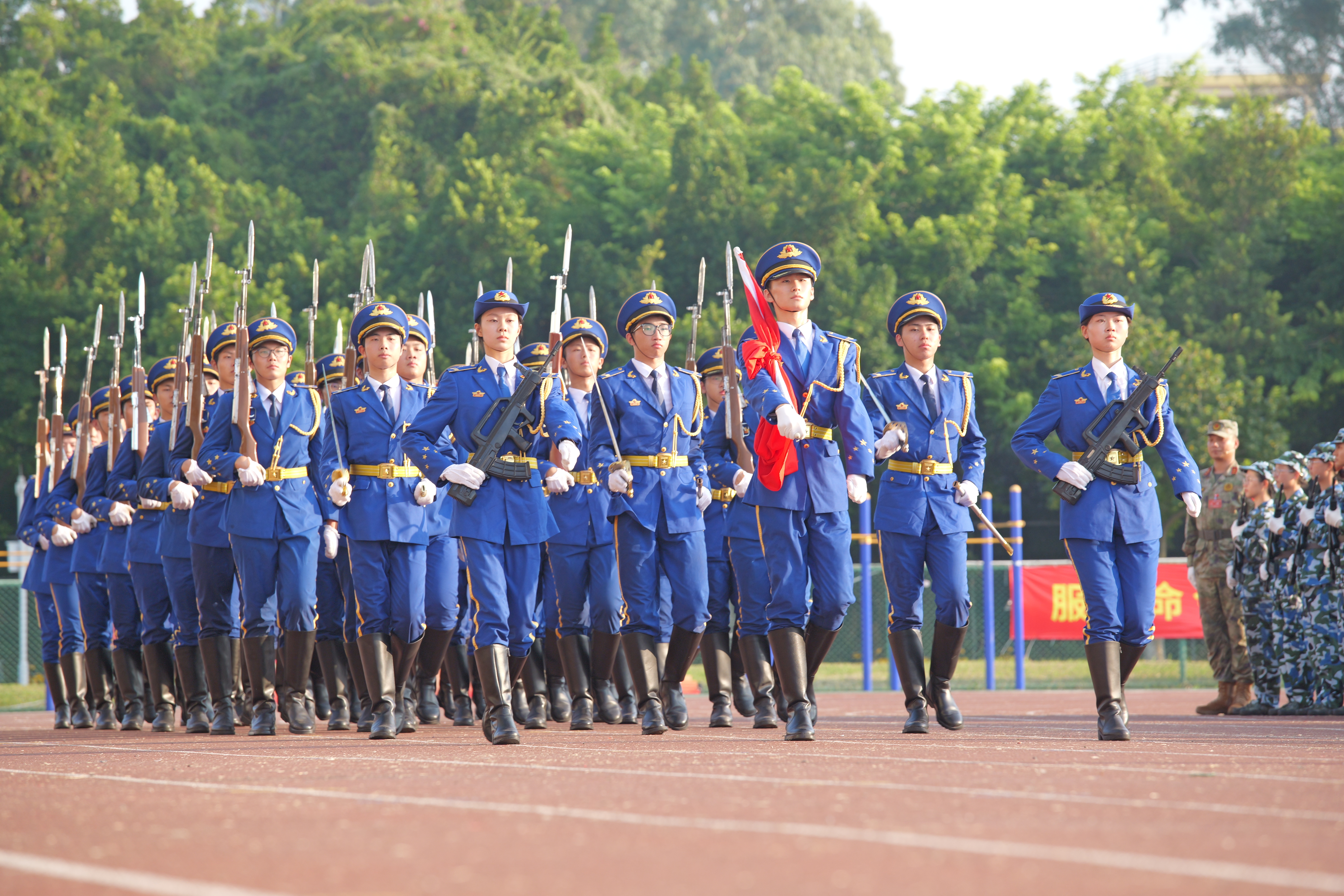 分列式及军事特色科目汇报中,同学们士气高昂、口号响亮、步伐矫健、队列整齐。军体拳、匕首操、短棍术、应急长棍……同学们眼神坚定、身姿矫健、口号铿锵,少年的热血与军魂,在此刻完美融合。军体拳中无惧烈日的坚毅,匕首操中铁血与柔情的结合,旗语方队有力的挥旗……每一个科目都是对他们努力与拼搏的最佳呈现。现场气氛热火朝天,男儿的铿锵斗志和女兵的巾帼风采赢得师生们阵阵掌声。