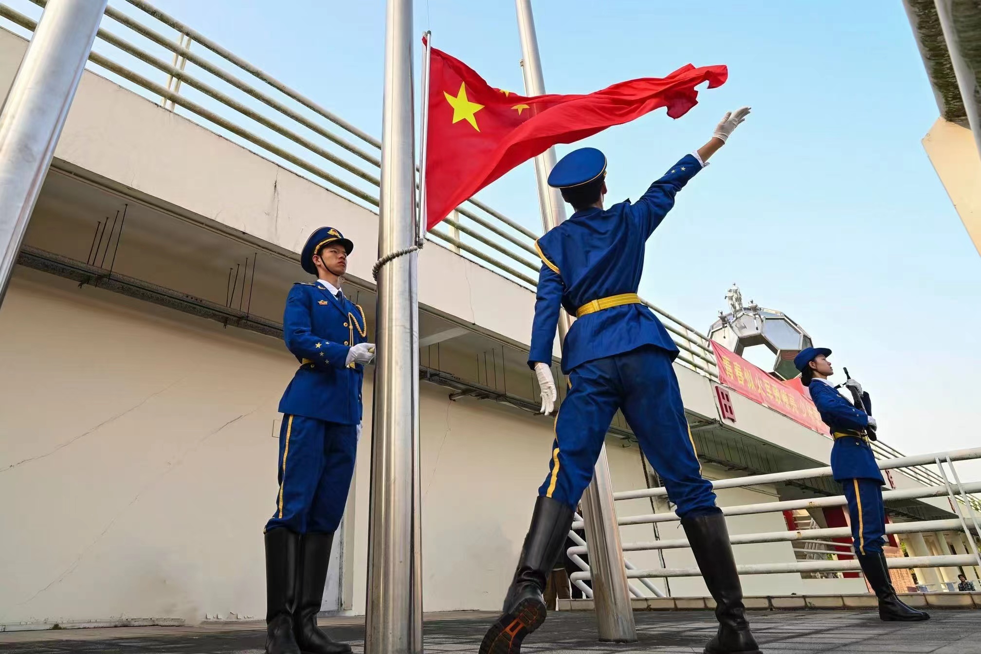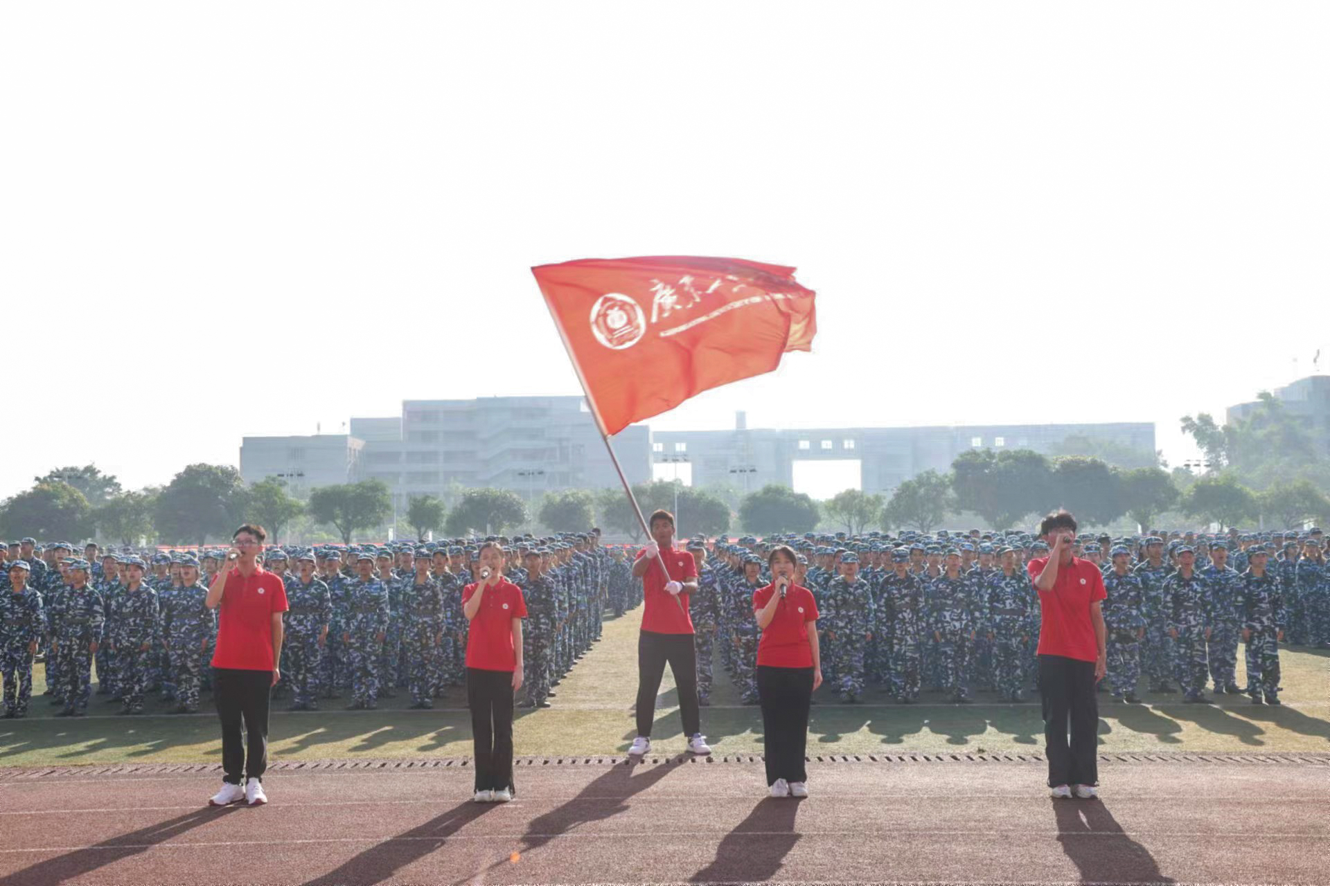 9月30日,华体会体育官方网站庆祝中华人民共和国成立75周年主题升旗礼暨2024级学生军训总结表彰大会在大学城校区、龙洞校区和揭阳校区举行,同升国旗、共唱国歌,为祖国母亲献上最真挚的告白。东风路校区同学在龙洞校区参会,番禺校区同学在大学城校区参会。一万余名新生经过14天的淬炼与蜕变,以威武的军姿、崭新的风貌、昂扬的精神展示军训成果,随冉冉升起的五星红旗一同表达对祖国的无限热爱。