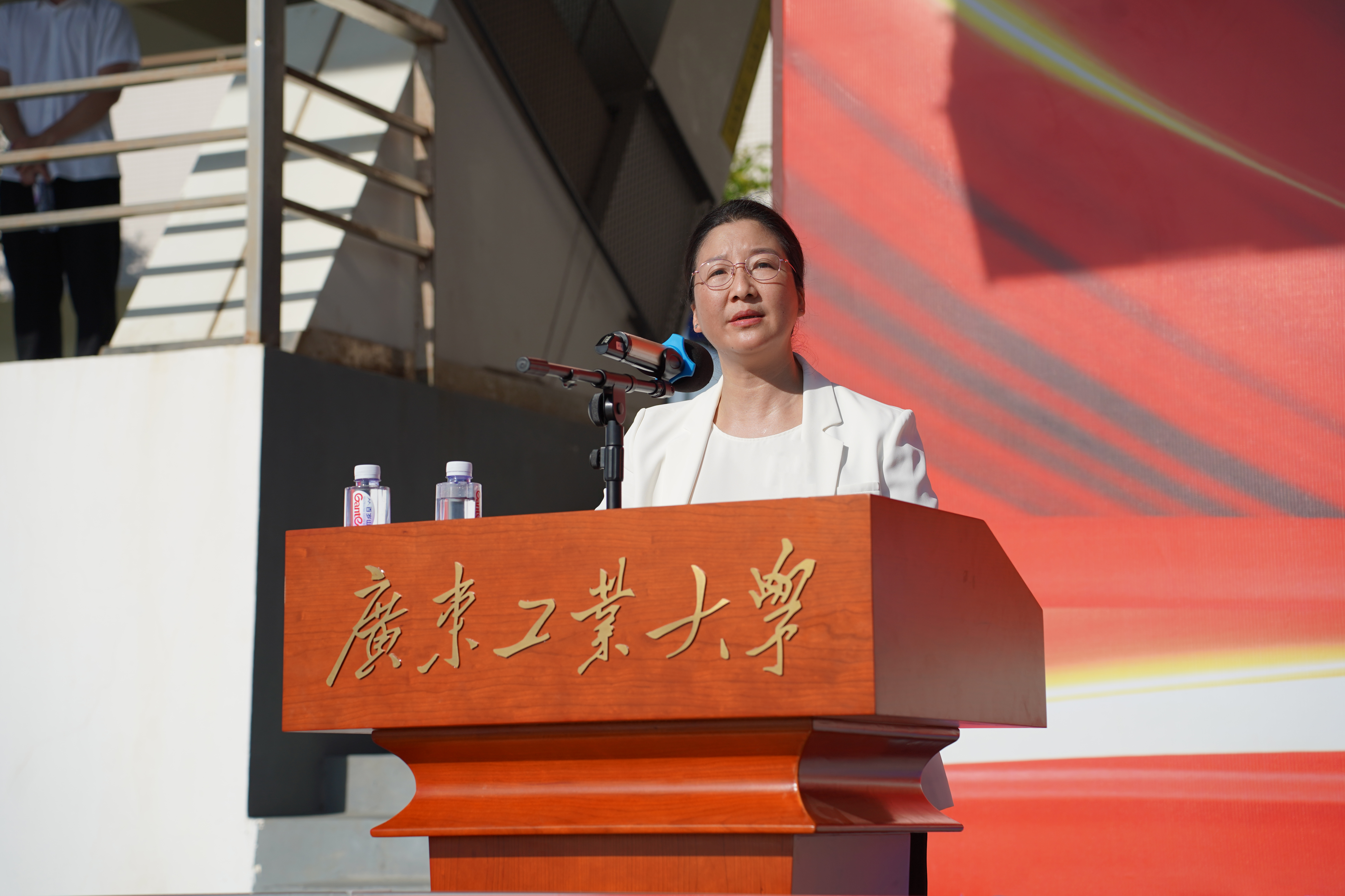 “同学们好!”“同学们辛苦了!”邱学青、朱蔚蔚、陈卓武分别在三校区向教官和新生表示慰问,并向承担本次军训任务的陆军特种作战学院、92822部队、广州市越秀区人民武装部、深圳市宝安区人民武装部、深圳市龙华区人民武装部赠送锦旗。