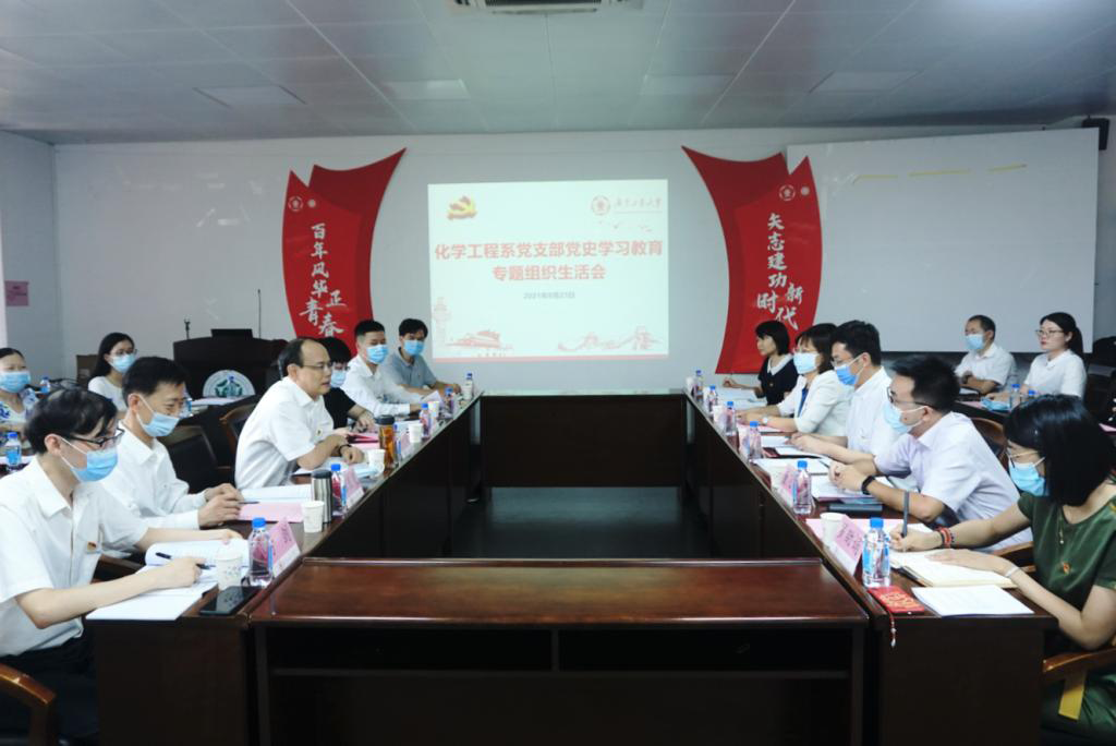 本网讯 8月23日下午,校党委副书记、校长邱学青以普通党员身份参加所在的化学工程系党支部党史学习教育专题组织生活会,认真学习贯彻习近平总书记在庆祝中国共产党成立100周年大会上的重要讲话精神,围绕“学党史、悟思想、办实事、开新局”主题,交流学习体会,检视自身问题,剖析思想根源,明确整改措施,切实把党史学习教育成果融入工作实践,加强党支部建设,充分发挥战斗堡垒作用。省委教育工委党史学习教育第五巡回指导组到会指导。校党委副书记陈良友,校党委常委、宣传部部长张育广,轻工化工学院负责人参加会议。党支部书记王铁军主持会议。