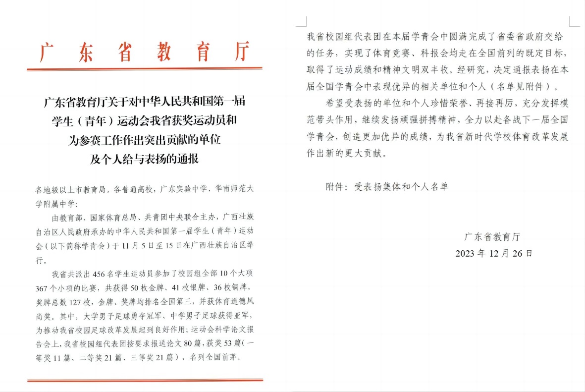 学校荣获首届全国学青会广东省校园组代表团“先进单位”荣誉称号