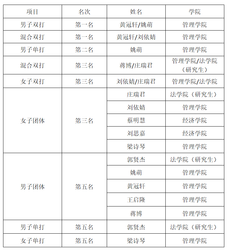 第28届中国大学生乒乓球锦标赛获奖情况一览表