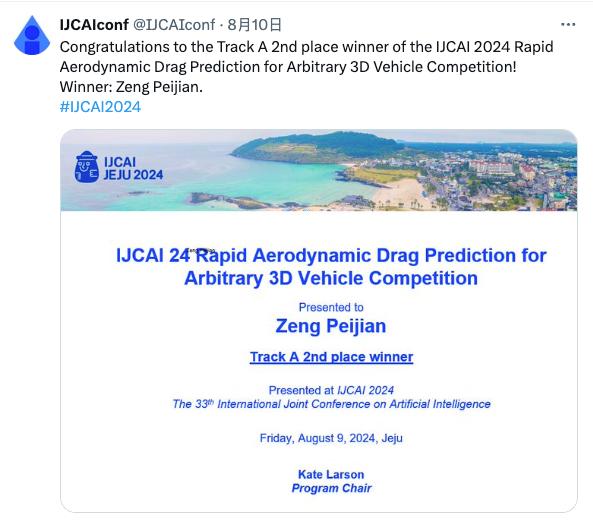 据悉, IJCAI(INTERNATIONAL JOINT CONFERENCE ON ARTIFICIAL INTELLIGENCE)是人工智能领域最具权威、最高水平、最具影响力的国际学术盛会之一,是中国计算机学会(CCF)推荐的A类会议。IJCAI2024在韩国济州岛举办,其“任意三维几何外形车辆的风阻快速预测竞赛”赛道吸引了全球300余支顶尖队伍参与,包括来自中科院、北京航空航天大学、浙江大学等国内外知名高校、科研院所和企业界代表。