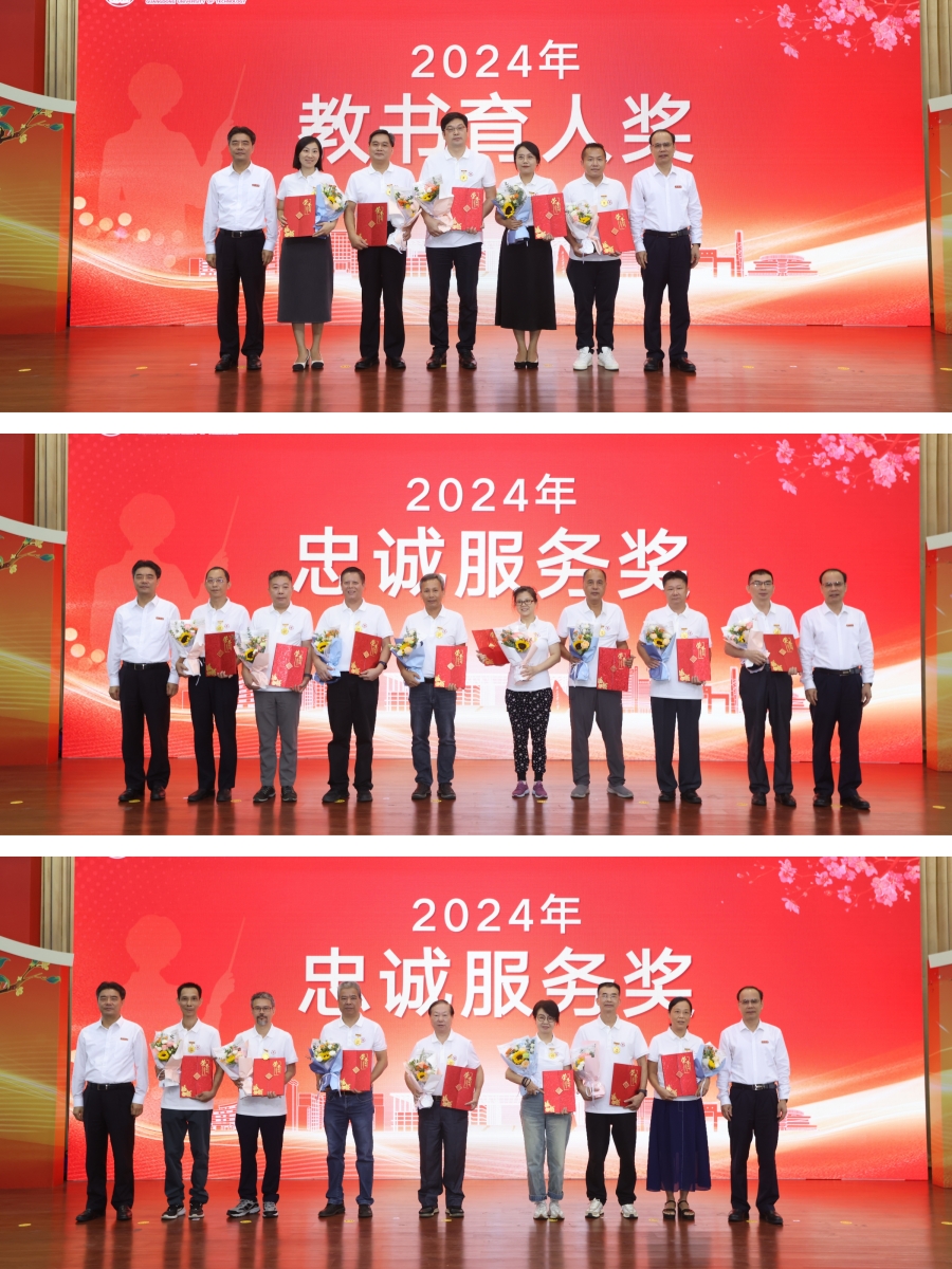 在热烈的掌声中,胡钦太和邱学青为“教书育人奖”和“忠诚服务奖”教职工颁发荣誉证书,表彰他们用奉献坚守岗位、以仁爱启智润心,立教育工作璀璨典范。
