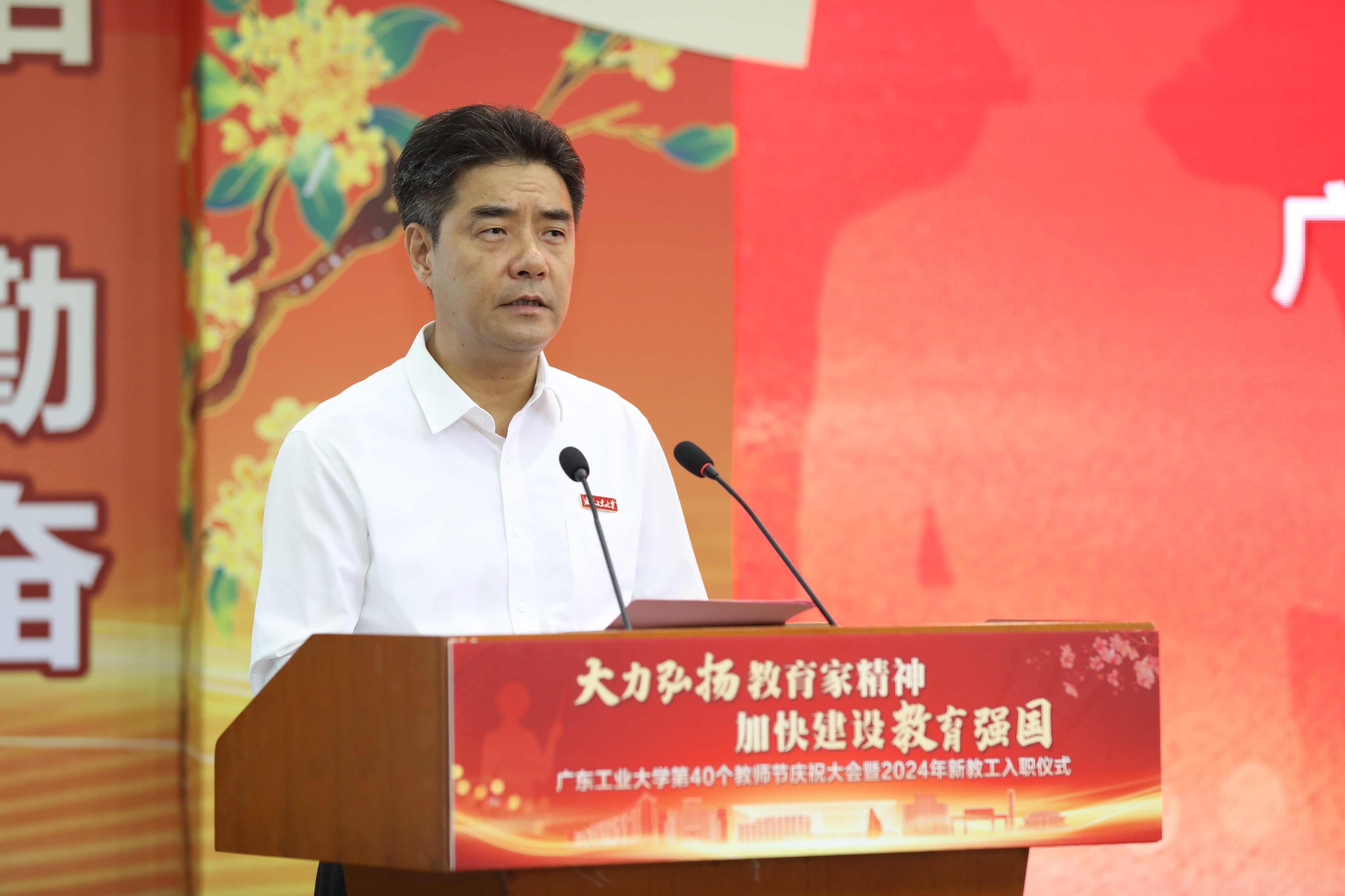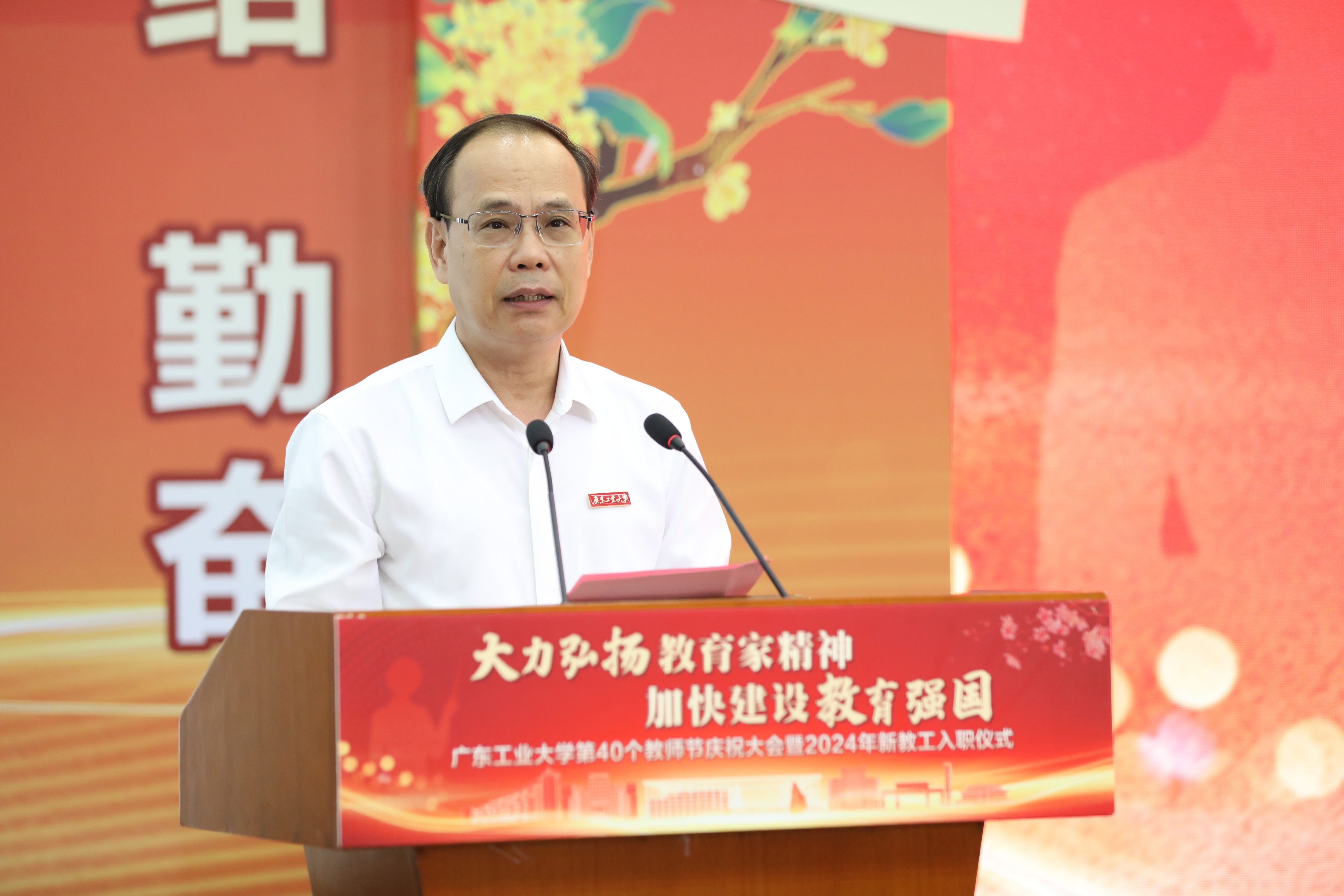 胡钦太代表学校向辛勤耕耘在教学、科研、管理和服务一线的全体教职工致以节日祝福。他指出,广工大发展的印记里镌刻着一代代广工教师奋斗不懈的身影,学校把教师队伍建设作为“重中之重”,深入实施“人才强校”战略,实现高质量跨越式发展。他强调要坚持凝心铸魂,深入贯彻落实党的二十届三中全会精神;聚焦“十五五”规划,奋力推进高水平创新型大学建设。他寄语广大教师特别是新教工,大力弘扬教育家精神,心怀“国之大者”,砥砺“大德行”、担当“大使命”、拓宽“大视野”,为强国建设、民族复兴伟业贡献教育力量。