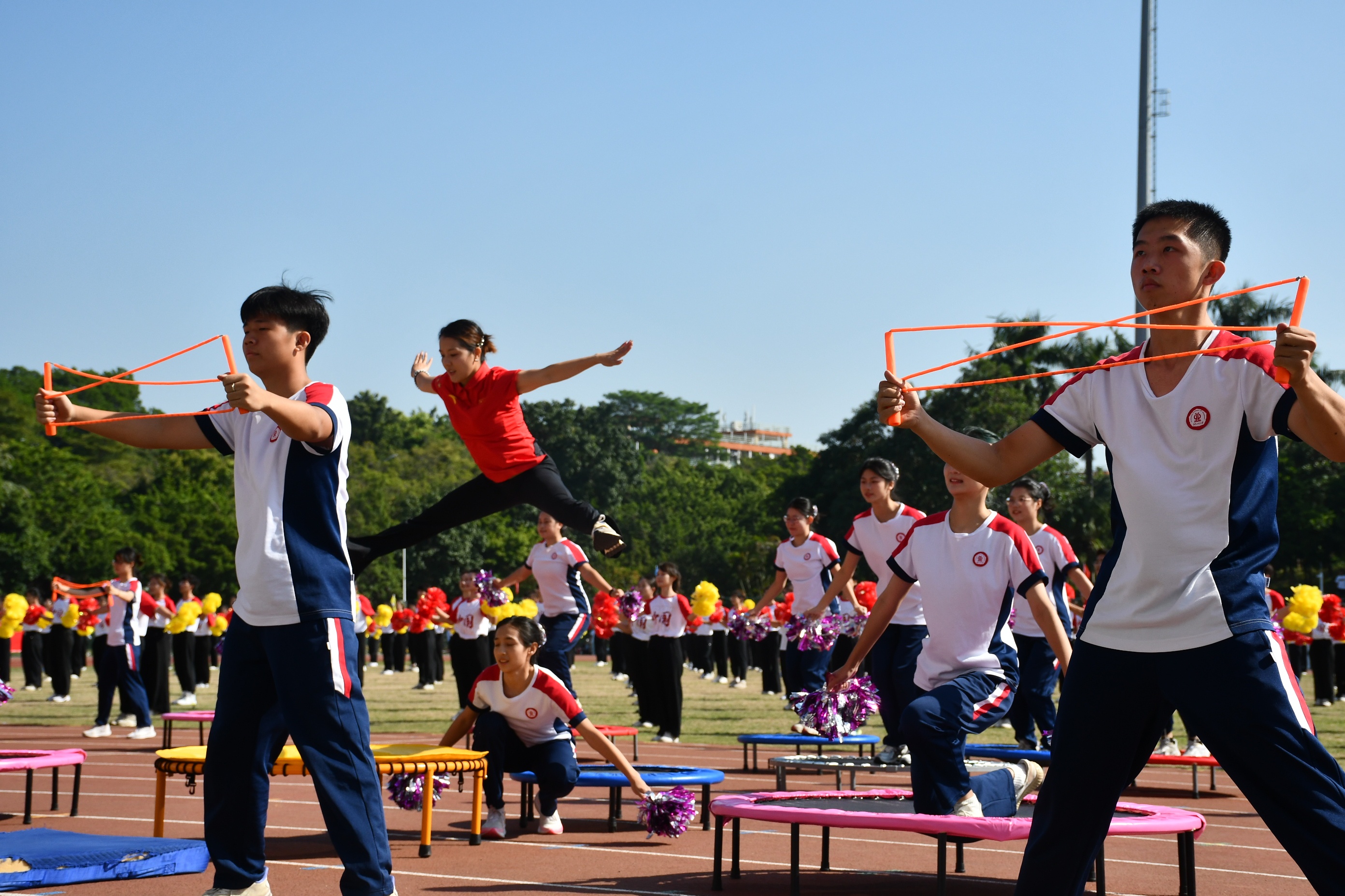 值得一提的是,今年开幕式新增的跳绳操表演结合大学生花样跳绳体育课程设计,展现了多样性和观赏性。指导老师陈玲作为优秀运动员、国际级运动健将,曾获得2017世界锦标赛冠军,同时也是蝉联第十二届全运会、十三届全运会的冠军。自2023年进入广工以来,陈玲老师结合自身项目的特色,在学校开设花样跳绳课程。花样跳绳在音乐律动的结合下,充分展现了跳绳的多变步伐,锻炼了大学生身体的协调性,不仅能够提升身体素质和技巧,还能通过团队协作呈现独特的魅力和精湛的技艺,深受大学生喜爱。此次节目融入了大众蹦床元素,陈玲老师结合跳绳和蹦床,较好展现了自身特色优势。