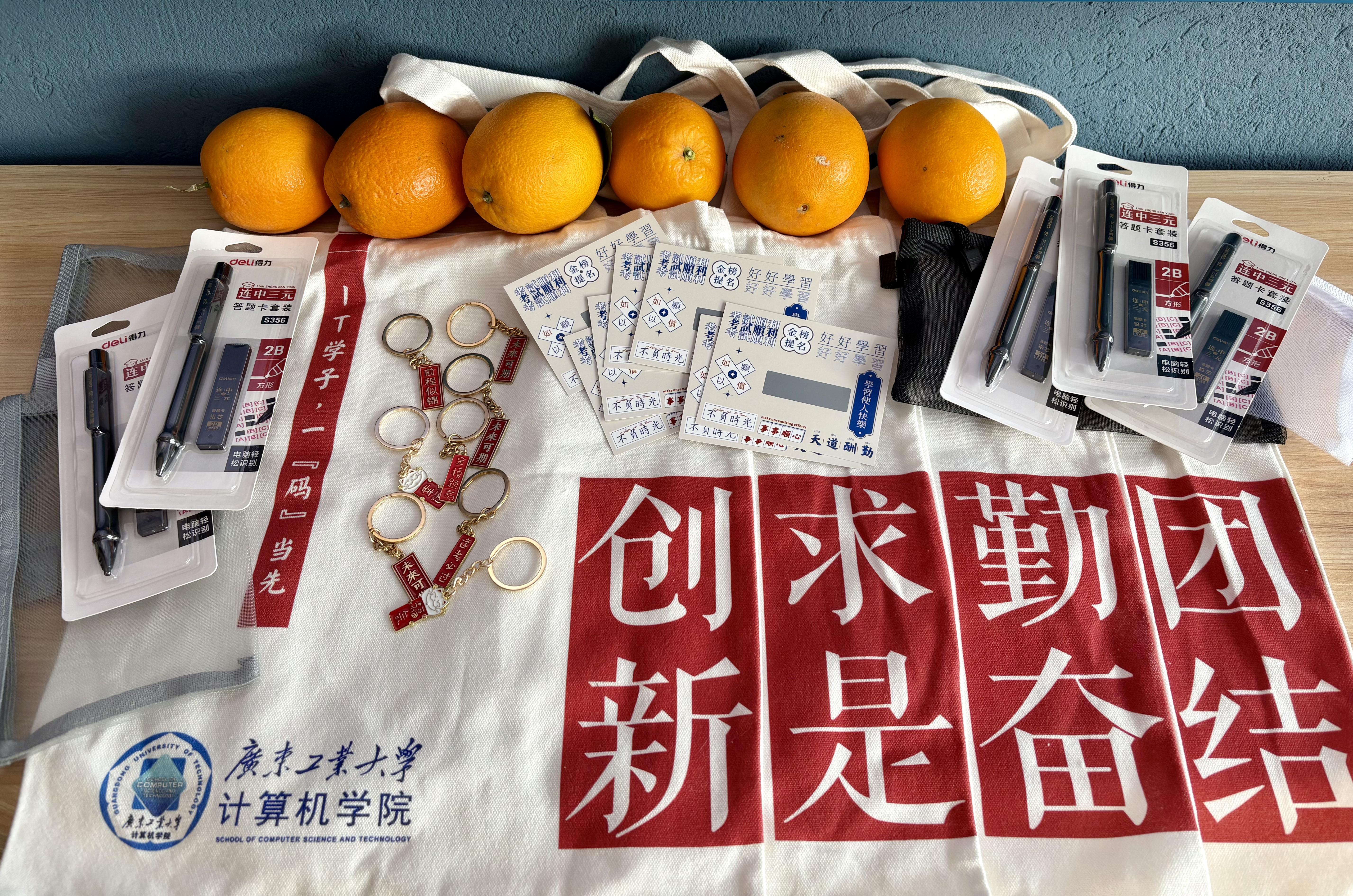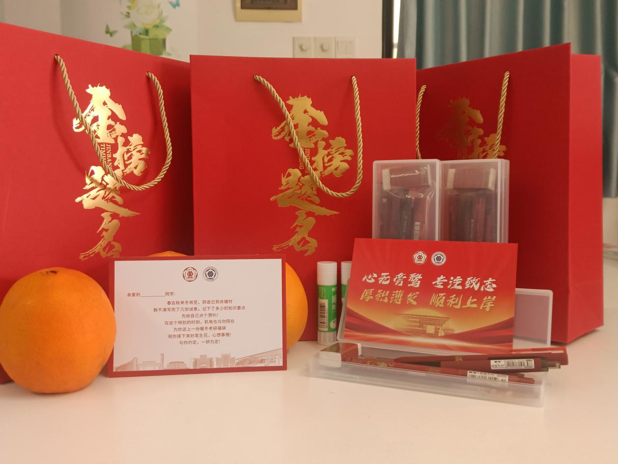 机电工程学院负责人、班导师代表、2021级本科生辅导员深入西区宿舍,亲自将350余份精心准备的“暖心大礼包”送到学生手中,并赠与暖心祝愿,希望同学们用最好的状态迎接考试。“暖心大礼包”内涵丰富、寓意深远。祝福卡片承载着学院对考研学子最真挚的期许与祝福,考研专用文具套装、橙子心意满满,祝愿考研学子妙“笔”生花、心想事“橙”、一战成硕。此间,老师们也深入学生宿舍,与同学们亲切交谈、加油鼓劲。关切询问同学们的备考情况及身体状态,嘱咐同学们以平和的心态、强健的身体迎接考试的到来。