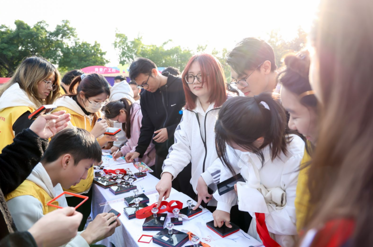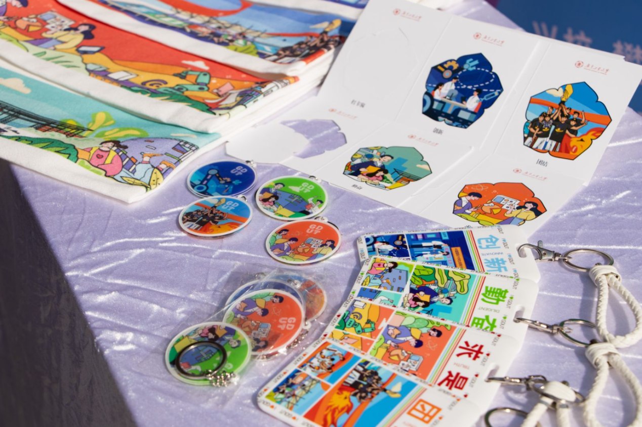 活动上,首次发布由2023级设计学硕士研究生金煜利用AI创作的活动主题曲《我爱广工的10000个理由》,由艺术与设计学院声歌队现场演绎。歌曲轻快悦耳,引起全场共鸣,备受好评。现场还设有五个特色环节:知校·情深叙怀:“我和广工的故事”视频共创;绘校·聚力添彩:“我为GDUT添新彩”彩绘共创;爱校·心心相印:“I ❤ GDUT”文创共创;荣校·光影芳华:“我与广工合个影”照片共创;兴校·攀撑永续:校训主题系列文创产品兑换。热情的广工师生纷纷以校训为引,畅谈“我与广工的故事”,讲述“我爱广工的理由”。活动主背景由现场观众、路过学生和志愿者共创完成,现场还有文创共创环保袋、明信片、卡包、钥匙链等校训主题创意文创派发,各摊位前人潮涌动,同学们纷纷用双手创作出独属于广工记忆的青春文创。