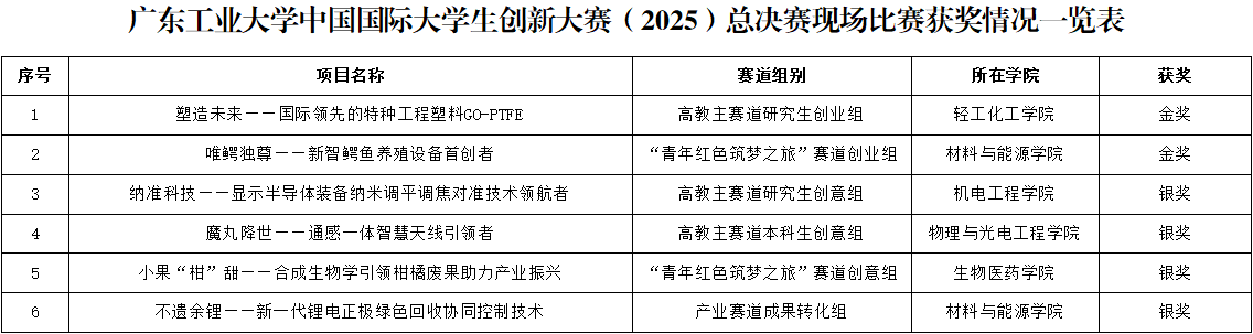 此次获奖的6个项目,涵盖了高教主赛道本科生组和研究生组、“青年红色筑梦之旅”赛道创意组和创业组以及产业赛道,实现了多赛道全面开花。成果充分展现了学校在推动科技成果转化与创新人才培养方面的积极探索,彰显了学校产教融合与服务区域经济发展的扎实成效。在学校锚定“双一流”建设目标、高质量推进“1+2+3”攀撑计划学科提升工程的进程中,将涌现更多优质创新创业项目,加速创新成果转化落地,为支撑国家重大战略需求与粤港澳大湾区建设持续注入“广工力量”。
