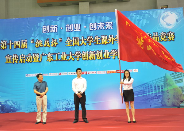 池志雄向“挑战杯”竞赛骑行天下宣传队领队、广州齐天下教育科技有限公司董事长王卫授旗。这标志着竞赛大型骑行宣传活动正式启动。米银俊、张学理为我校创新创业训练基地揭牌。机电工程学院院长郭钟宁、建筑与城市规划学院院长朱雪梅与企业代表为我校首批大学生创新工作室揭牌。