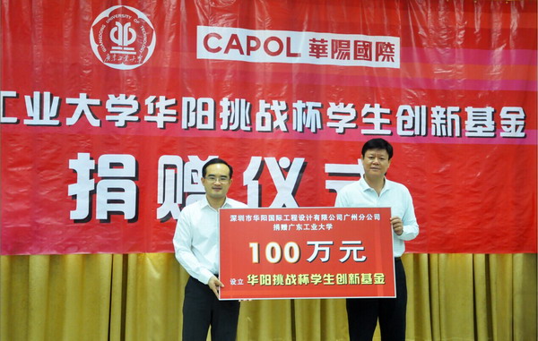 本网讯10月14日上午,华阳国际设计集团广州分公司向建筑与城市规划学院捐赠的100万元“华阳‘挑战杯’学生创新基金”正式签约。校党委书记苏一凡、章云副校长,华阳国际设计集团副总裁邹展宇、经理武建华,学校校友工作及社会联络办公室、党委宣传部、校团委,建筑与城市规划学院等单位负责人等出席捐赠仪式。