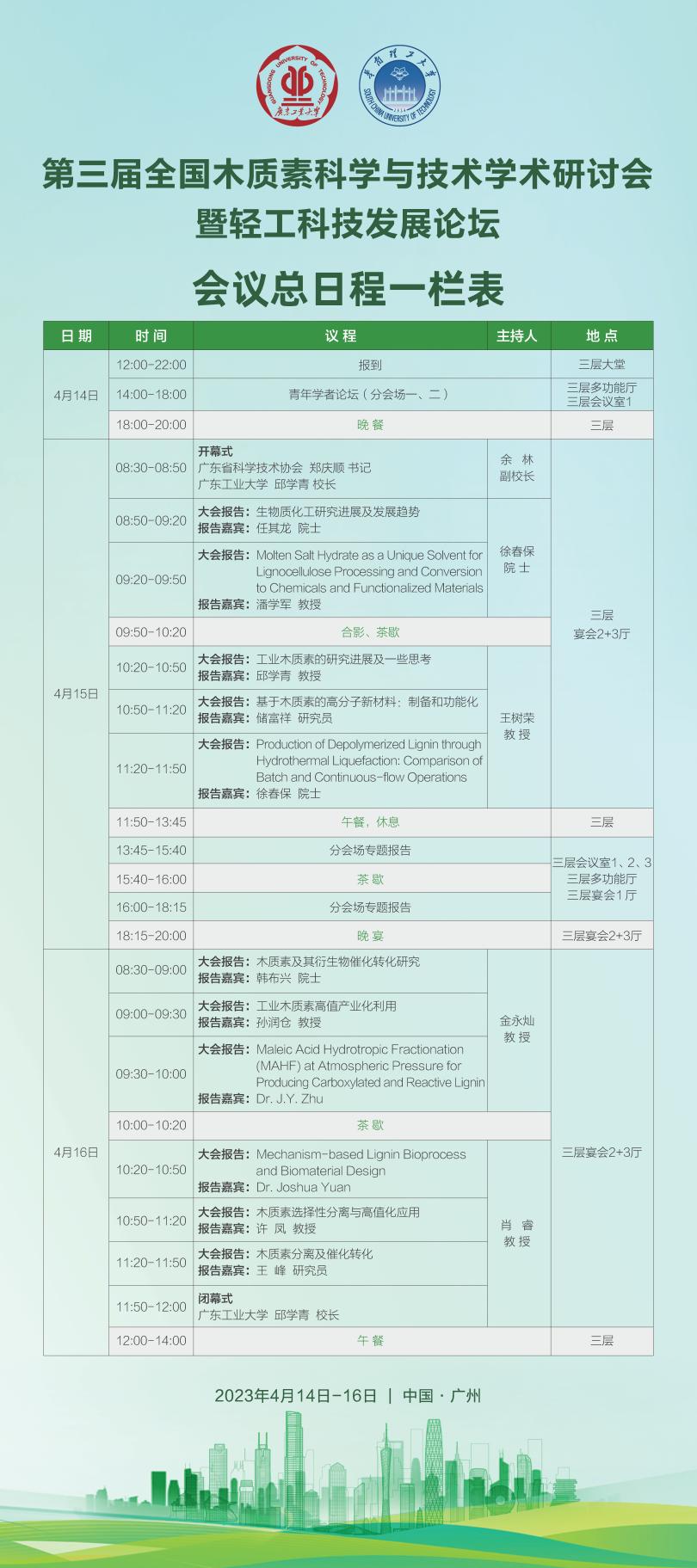 为促进木质素相关领域学术交流和技术创新,由华体会体育官方网站、华南理工大学、中国科学院大连化学物理研究所、广东省化工学会、广州市化学化工学会等主办的“第三届全国木质素科学与技术学术研讨会暨轻工科技发展论坛”将于2023年4月14-16日在广州市生物岛香岚酒店召开。