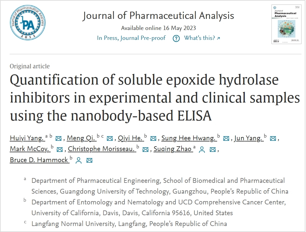 2023年5月,华体会体育官方网站生物医药学院赵肃清教授团队在药学顶级期刊《Journal of Pharmaceutical Analysis》发表研究论文。论文题为“Quantification of soluble epoxide hydrolase inhibitors in experimental and clinical samples using the nanobody-based ELISA”(https://doi.org/10.1016/j.jpha.2023.05.006),该论文第一作者为我校生物医药学院20级博士研究生杨慧怡,通讯作者为赵肃清教授和Bruce D. Hammock院士。我校为论文第一完成单位,合作单位为美国加州大学戴维斯分校(University of California, Davis)。