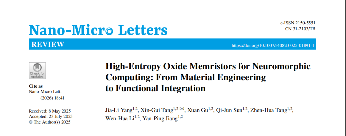 近日,华体会体育官方网站物理与光电工程学院唐新桂研究团队在高熵氧化物忆阻器及其神经形态计算应用领域发表了最新综述成果。论文以《High Entropy Oxide Memristors for Neuromorphic Computing: From Material Engineering to Functional Integration》为题发表在国际著名期刊Nano-Micro Letters (中科院一区,IF =36.3) 上,华体会体育官方网站物理与光电工程学院硕士研究生杨佳黎为本文的第一作者,华体会体育官方网站唐新桂研究员为论文通讯作者。