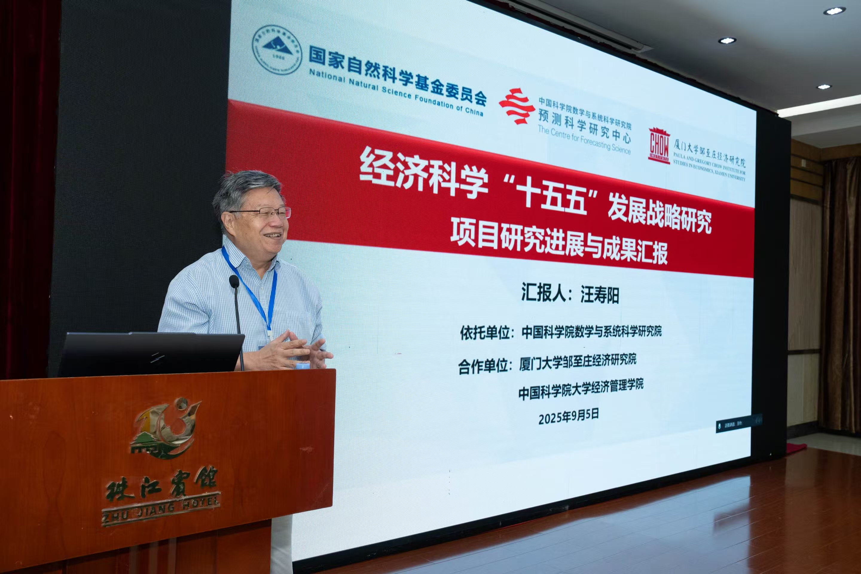 发展中国家科学院院士、中国科学院杰出研究员、中国科学院数学与系统科学研究院预测科学研究中心主任汪寿阳教授代表课题组作了题为“经济科学‘十五五’发展战略研究”的主旨报告。报告聚焦经济学科的发展趋势,回顾了经济科学“十五五”发展战略研究项目的研究进展与成果、经济科学学科在国内的发展现状,提出了未来5年发展布局与优先领域以及保障措施和政策建议。汪寿阳教授指出了在当前的时代背景下经济科学需要肩负的任务与使命,同时对经济科学各学科的现状与发展趋势进行了分析,并提出了下一步的工作计划。