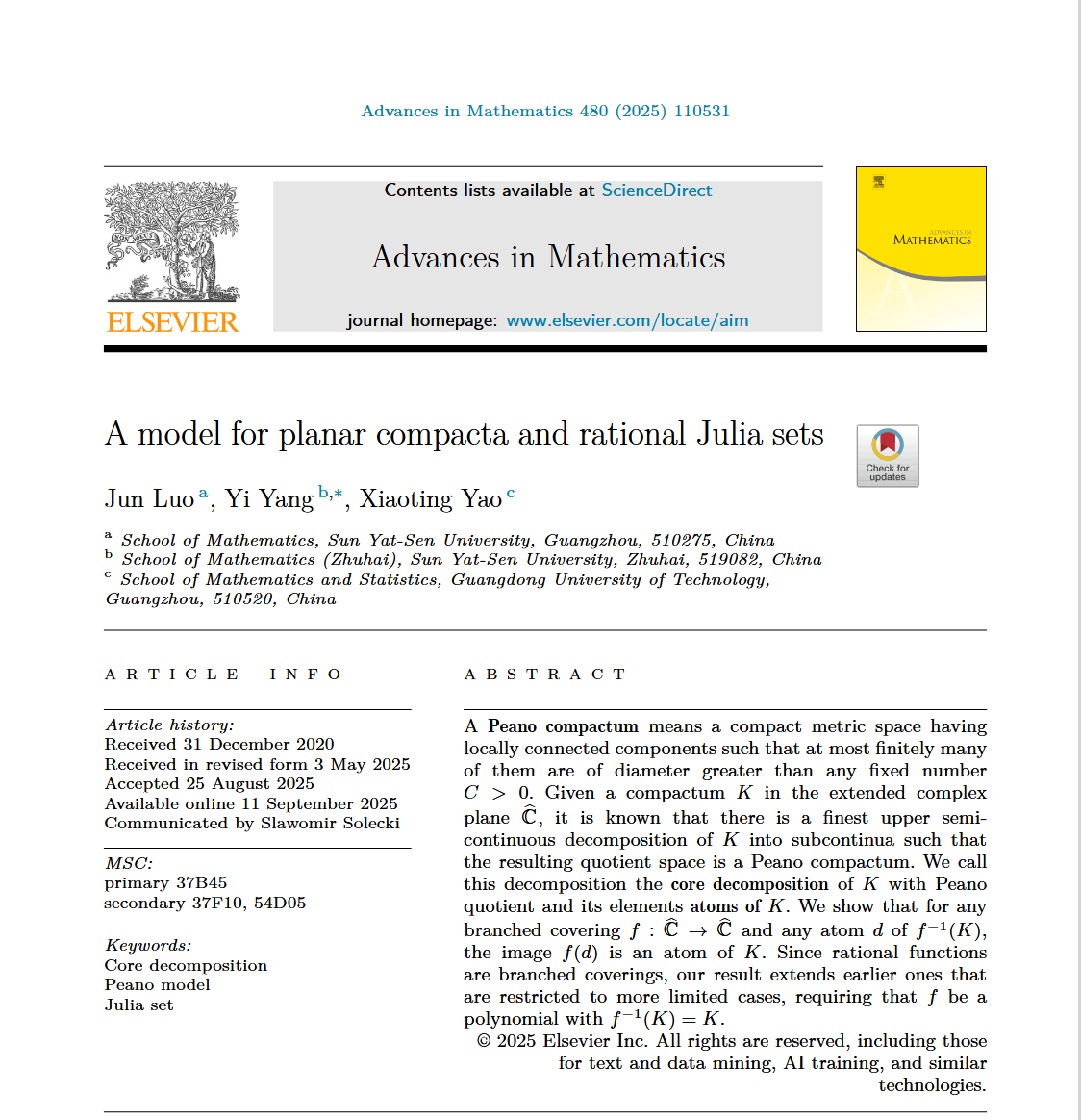 近期,华体会体育官方网站数学与统计学院教师姚晓婷与中山大学数学学院罗俊教授,中山大学珠海校区数学学院杨毅助理教授在平面紧集的Peano模型理论研究中取得重要进展,相关研究成果以“A model for planar compacta and rational Julia sets”为题,发表在国际著名期刊《Advance in Mathematics》上(署名按作者姓氏字母顺序排列)。