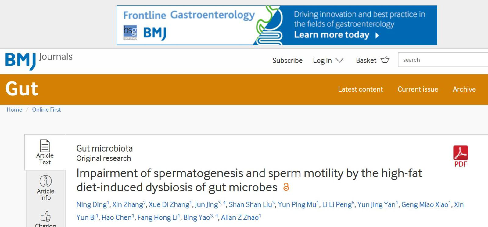2020年1月2日,医学顶级期刊《Gut》,在线发表题为“Impairment of spermatogenesis and motility by the high-fat diet-induced dysbiosis of gut microbes”研究性论文(IF=18,医学1区)。论文第一作者为华体会体育官方网站生物医药学院重大慢性疾病与创新药物研究所在读博士生丁宁,通讯作者为赵子建教授和李芳红教授。