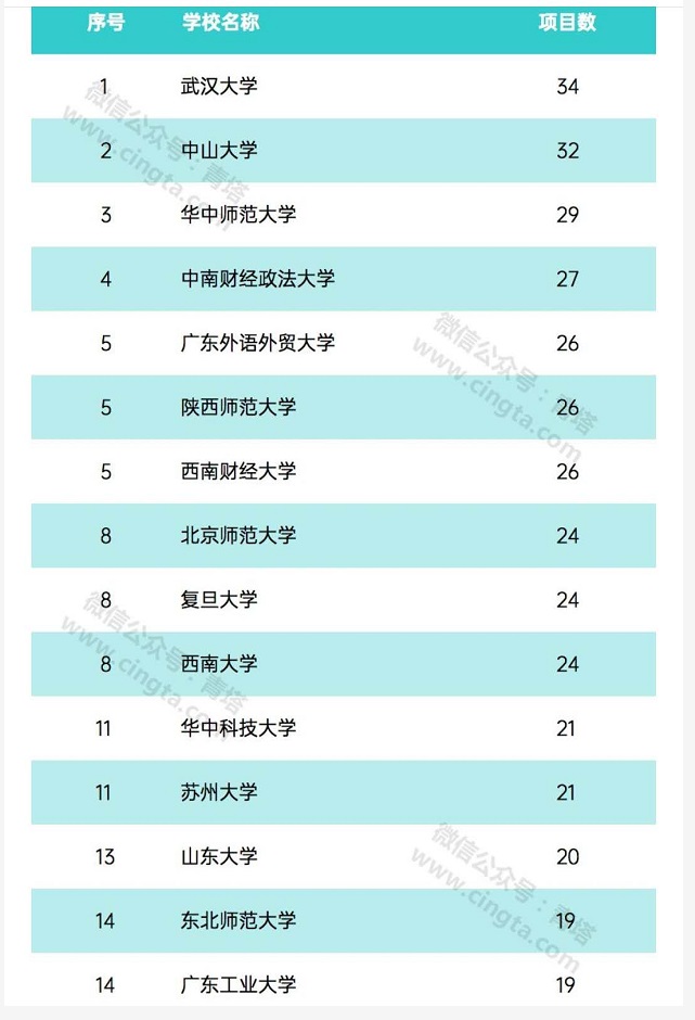 近日,教育部社会科学司公布了2020年度教育部人文社会科学研究一般项目立项结果。其中,规划基金、青年基金、自筹经费项目共2620项,西部和边疆地区项目173项,新疆项目12项,西藏项目6项。我校共有19项获批立项,位居全国第十四位,创我校历史最好成绩。