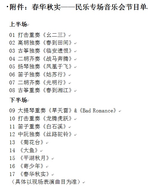 春发其华,秋收其实。为进一步丰富校园文化生活、提高广大师生艺术修养,展示排练成果,我校民乐团将举办《春华秋实》民乐专场音乐会,诚挚邀请广大师生前来欣赏!