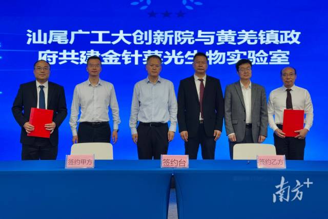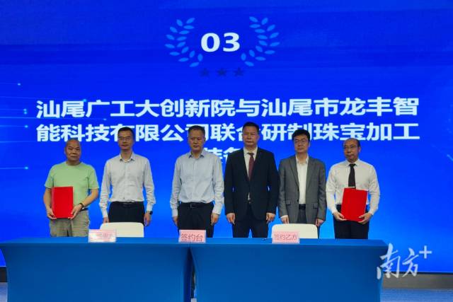 会上,汕尾市广工大科技产业协同创新研究院与海丰黄羌镇人民政府签订共建黄花菜光生物实验室合作协议,将在仿日光光源在金针菜加工工艺中的应用、光照对金针菜花期延长及营养成分的影响、光谱技术结合冷链的金针菜保鲜工艺、仿日光照射下的金针菜育种技术优化等方面开展研究;汕尾市广工大科技产业协同创新研究院与汕尾市龙丰智能科技有限公司签订联合研制珠宝加工装备合作协议,在改进加工设备、生产链条与制作工艺,推动全链条智能升级等方面进行合作。