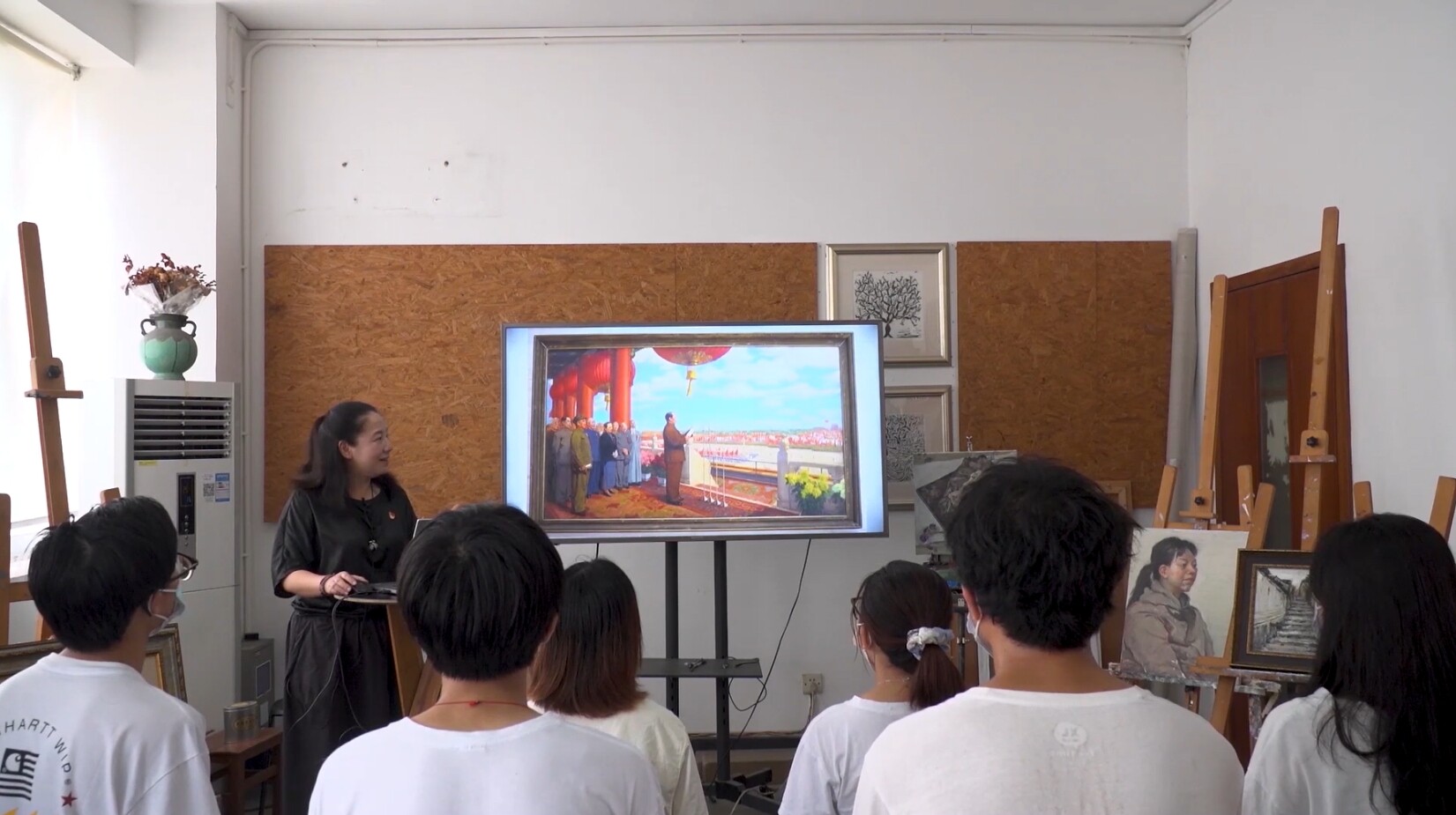 “带领学生一起‘求真、向善、崇美’,就是在塑造他们的‘根’和‘魂’,就是在培育祖国的未来、民族的希望。”作为艺术与设计学院美术系教师,蒋弘烨将专业教育与思想引领相融合,一边引导学生欣赏《开国大典》《跨过鸭绿江》等经典画作的人物形象、环境描画、色彩搭配等技法表现形式,一边讲述作品背后的历史事件和英雄人物事迹。